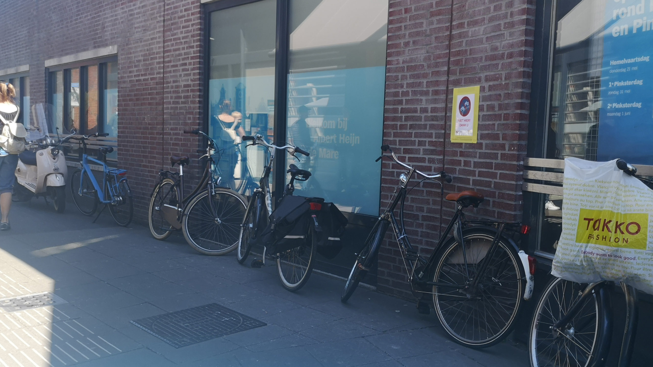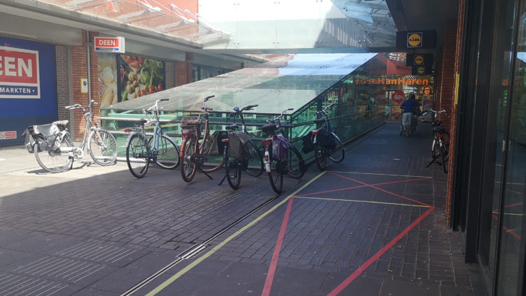 Daarnaast parkeren de mensen hun fiets gerust voor de ingang van de winkel waar ze even moeten zijn, en dranghekken die rondom de dino-glijbaan zijn geplaatst lijken een magische aantrekkingskracht te hebben op mensen die met de fiets boodschappen komen doen.