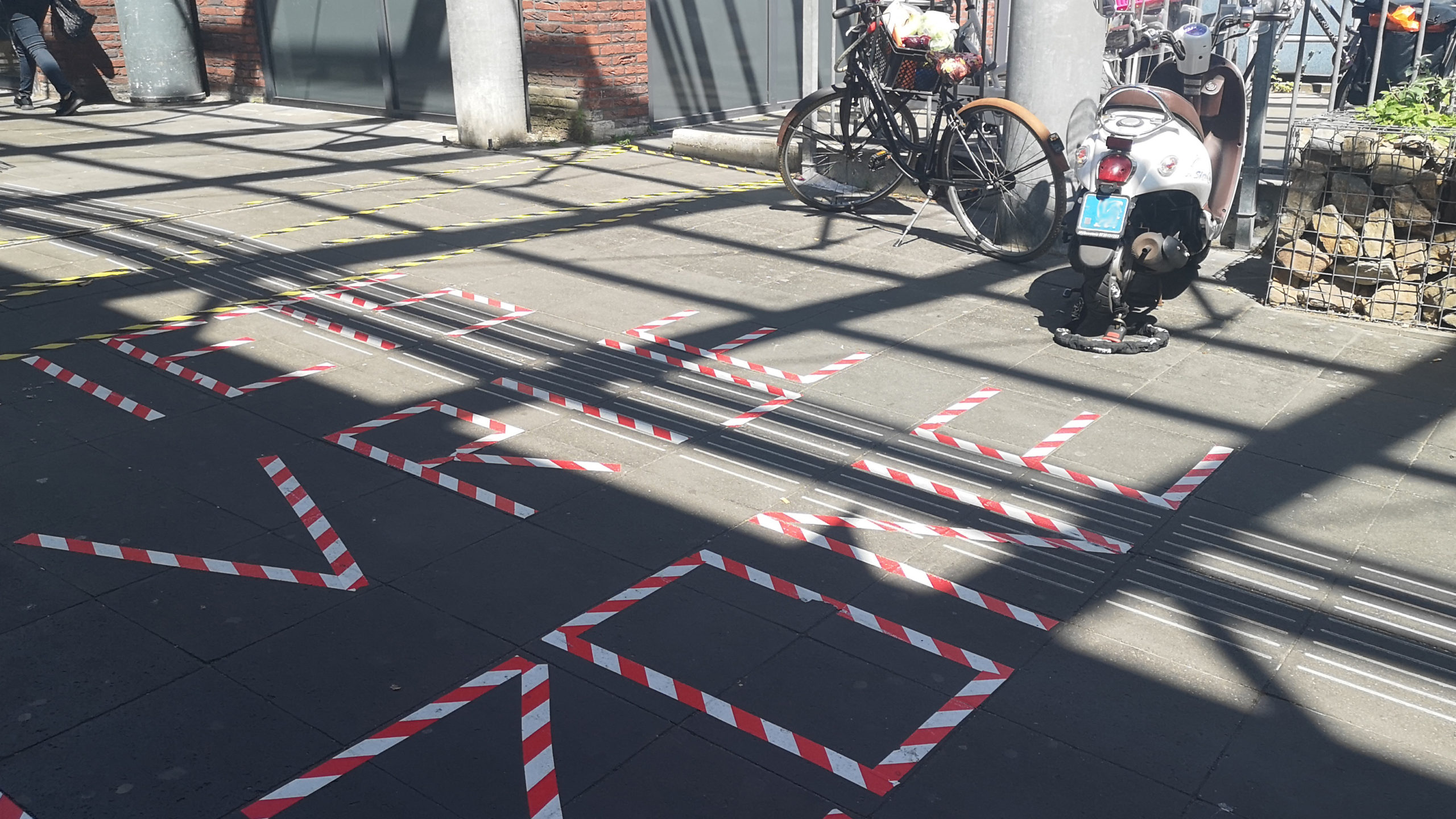 Het blauwe spandoek bij de ingang spreekt boekdelen, maar slechts 20 meter verderop, waar nota bene nog met rood-wit plakband op de grond is aangegeven dat het om een fiets-vrije zone gaat, staan er meerdere fietsen en een scooter geparkeerd. Ook de affiches op de muren in het winkelcentrum zijn ogenschijnlijk aan blindemansogen gericht. En waarschijnlijk mag bij de rood-witte letters op de grond nog net wel gestald worden, maar een dwars staande scooter levert natuurlijk ook een versmalling op.