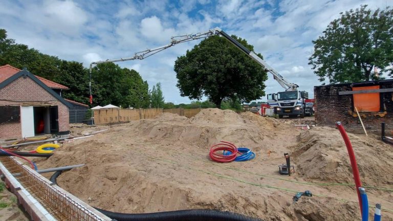 Aan de Oude Schulpweg in Egmond-Binnen werd dinsdag begonnen met het storten van het beton voor de nieuwe fundering voor de nieuwe stolpboerderij voor restaurant Nieuw Westert. Bouwbedrijf Pronk uit Warmenhuizen zit hiermee op schema.