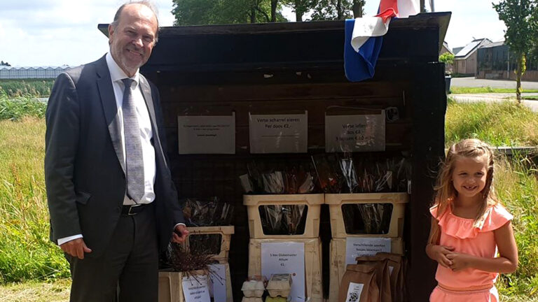 Blase hoorde helaas een veel negatiever verhaal bij Alliums. De teler in het Altongebied zag de omzet kelderen. "Van de snijbloemen konden we nog maar 25 procent op de veiling brengen. Van onze bollen moeten we nog maar afwachten hoe de afzet loopt. Maar we kijken vooruit". De enige lucratieve 'bedrijfstak' wordt gerund door de 6-jarige Bente, dochter van een van de eigenaren. Zij verkoopt bloemen, bollen en ook eieren in een kraampje aan de Schoutenbosweg 5.