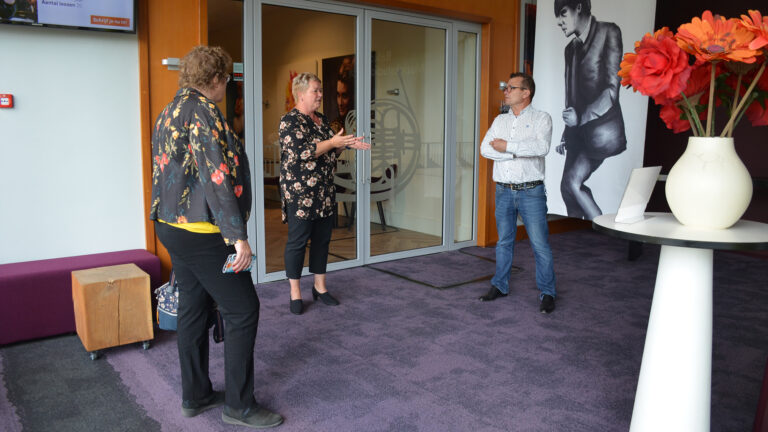De coronacrisis trof Cool kunst en cultuur frontaal. Toen werd aangekondigd dat culturele centra weer beperkt open mochten, staken ze daar direct de handen uit de mouwen om voorstellingen zo goed en leuk mogelijk te organiseren voor hun bezoekers. "We hebben een nieuwe tribune gebouwd, zodat we maximale zaalbezetting hebben", vertelt Esther De Koning aan wethouders John Does en Annette Valent, terwijl ze trots de sfeervolle zaal laat zien. Verder is er veel contact tussen de gemeente en Cool. "Daar zijn we heel blij mee."