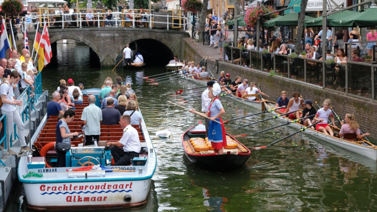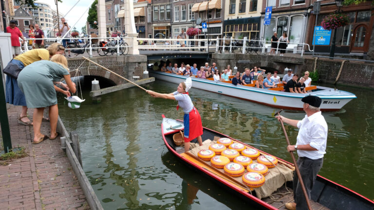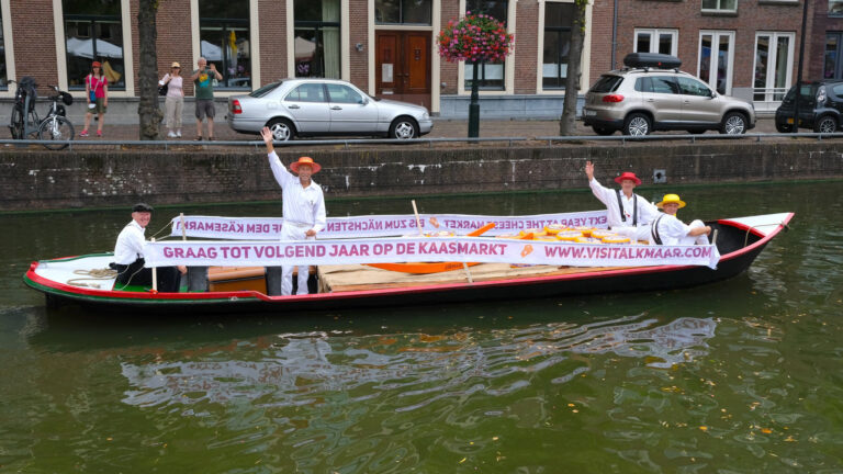 Om hen enigszins tegemoet te komen en een, zij het minimale, kaasbeleving te bieden zonder dat dit nog meer toeristen trekt voeren er vrijdag 'kaasboten' door de Alkmaarse grachten. Uiteraard waren het de Langedijker koolschuiten die normaliter deel uitmaken van het wekelijkse kaasspektakel. Op de schuiten: kaasvader Willem Borst, een aantal kaasdragers en natuurlijk kaasmeisjes.