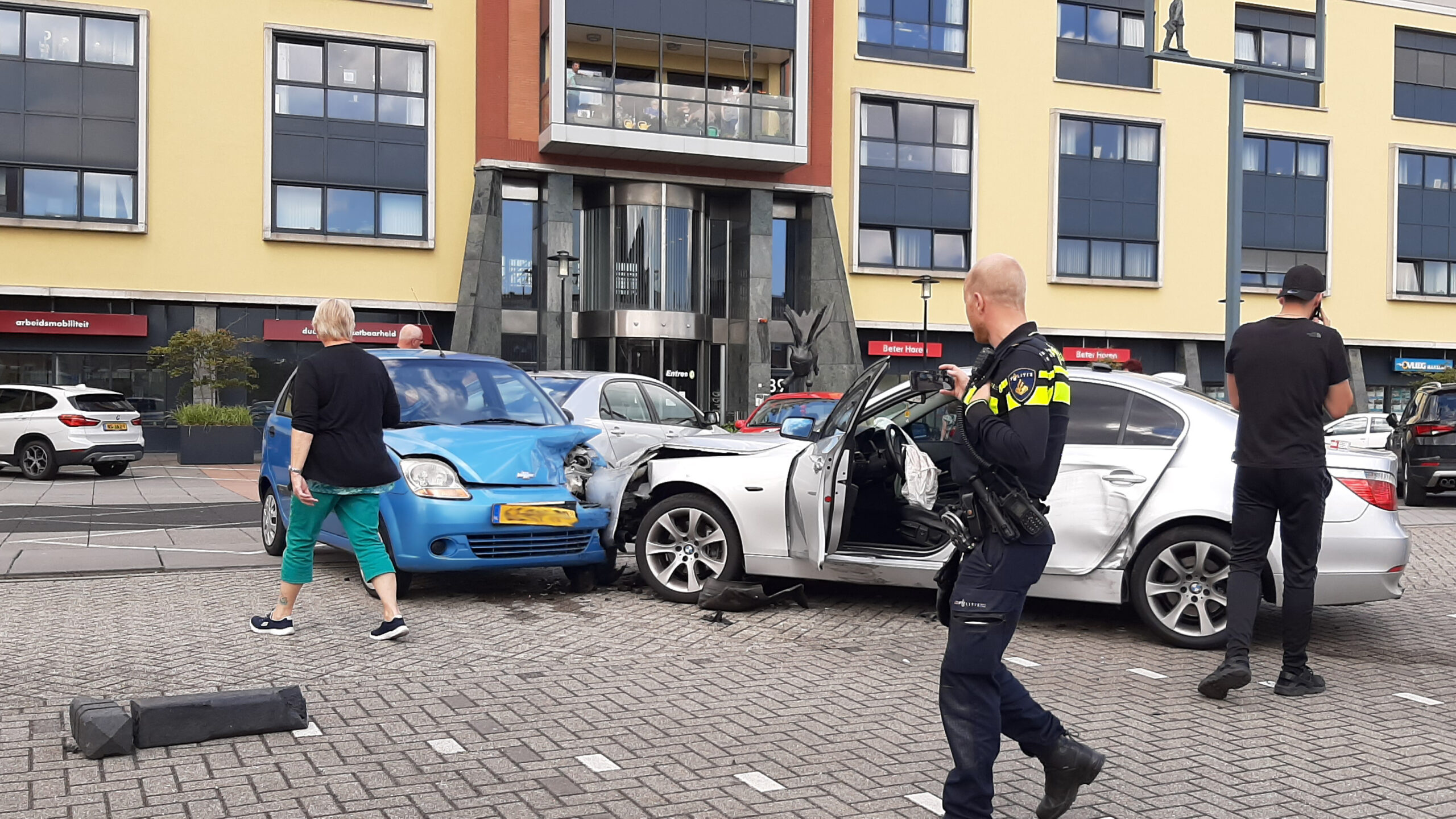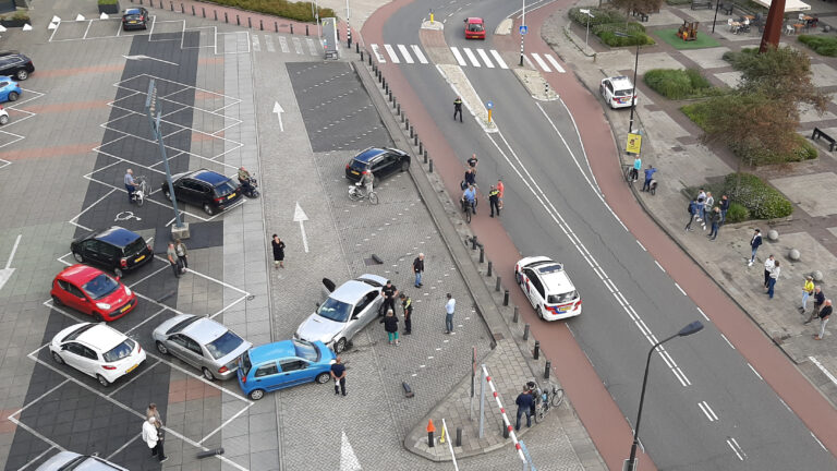 Dat één en ander gepaard ging met een flinke snelheid blijkt uit de afstand die de afgebroken paaltjes na de klap aflegden. Niets vermoedende voorbijgangers die zo'n tien meter verderop liepen, ontsnapten er ternauwernood aan. Twee geparkeerde auto's (de rode en de witte) liepen ook schade op door rondvliegende paaltjes.