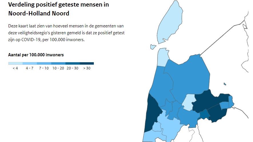 Hij kan geen uitspraak doen over specifieke stijgingen. Zo zijn in Drechterland, Medemblik en Bergen het aantal besmettingen erg hoog - en zijn die dus donkergekleurd.