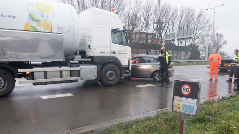 Een vrouw probeerde woensdagochtend nog net voor een vrachtwagen de N242 op te rijden vanaf de Diamantweg, maar dat liep verkeerd af. Haar auto kreeg een tik en kwam voor de tankwagen dwars op de weg te staan. De bestuurster was ongedeerd, maar dusdanig van de rel dat ze niet meer in staat was om verder te rijden.