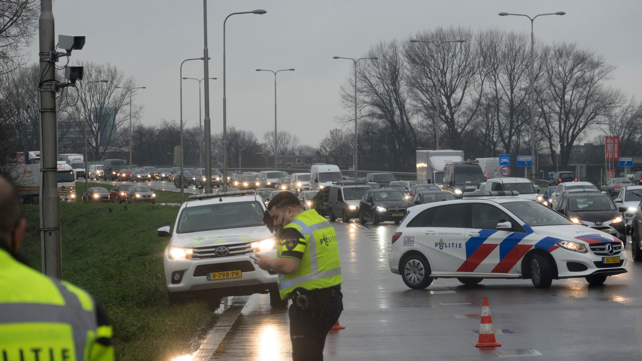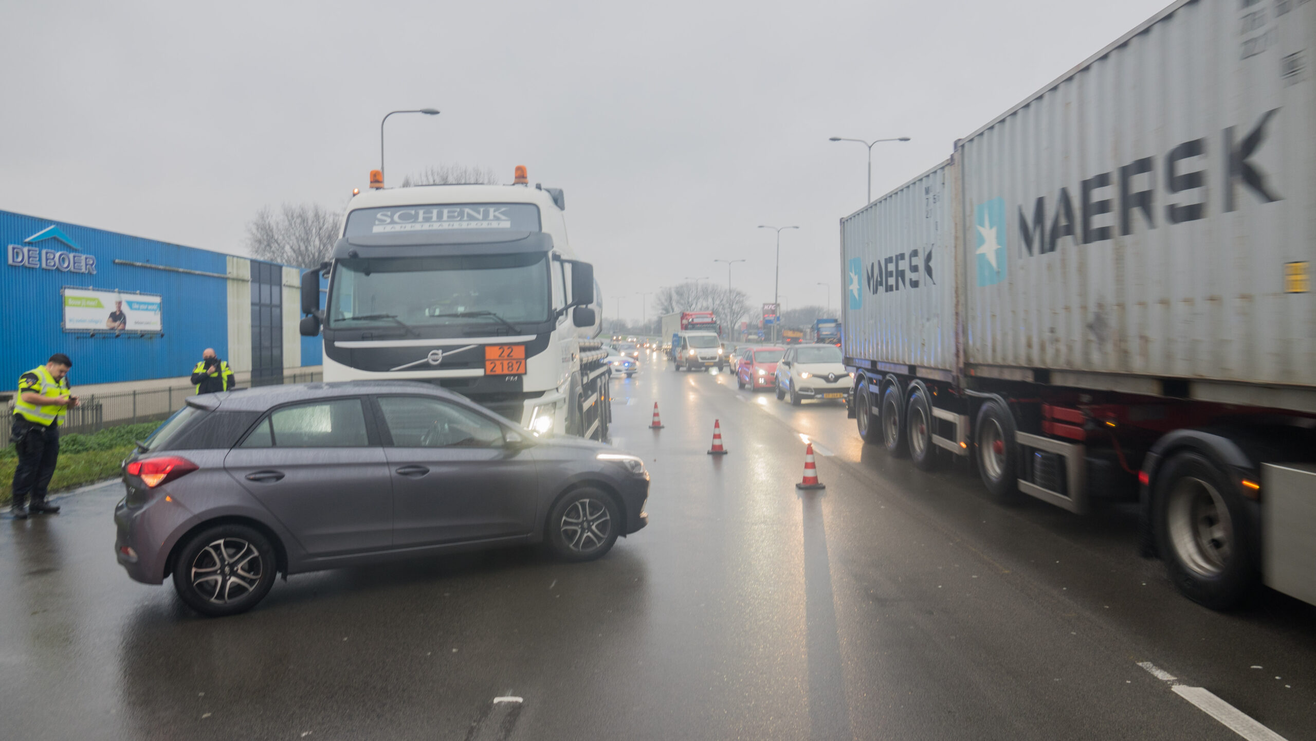 De weg was druk en de brug was open geweest, dus er werd niet hard gereden. De chauffeur van de tankwagen met gevaarlijke stoffen bood zo'n zes autolengtes ruimte voor verkeer vanaf de Diamantweg, maar ondanks dat dook een auto te kort voor zijn neus de ringweg op. De chauffeur kon niet meer op tijd stoppen, tikte de auto aan en duwde deze dwars op de weg. De schade viel mee maar de bestuurster was erg overstuur. Haar auto is geborgen.