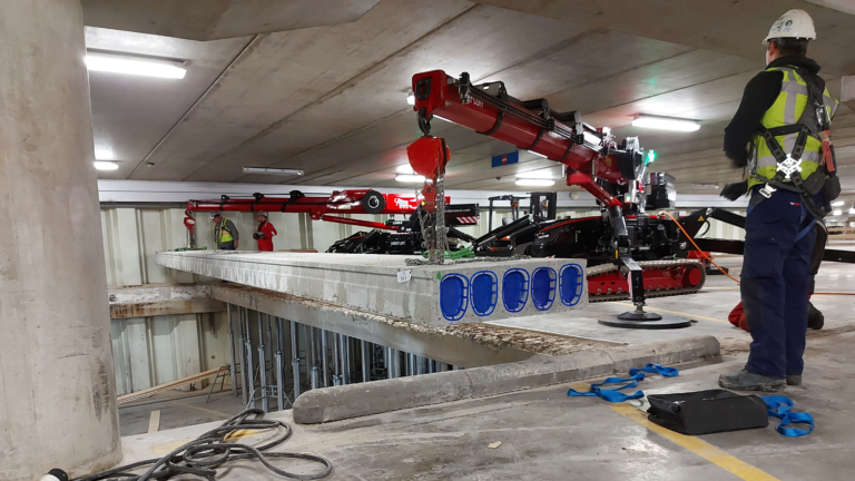 Door de hitte die bij die brand vrij kwam zijn ook een aantal betonnen platen aangetast. De betreffende platen vormen het dak/parkeerdek tussen de verdiepen en zijn er tijdens de bouw met een flinke kraan vanaf de bovenzijde ingehesen. Die mogelijk is er uiteraard niet meer, dus moeten de oude platen worden verwijderd en de nieuwe platen worden geplaatst met slechts 2,5 meter hoogte om te werken. De platen zelf zijn 4 meter lang, zo'n 1,5 meter breed en 40 cm dik. Ze wegen 5.000 kilo per stuk.