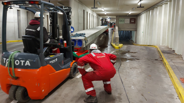 Het vervangen is dus wel een specialistische klus en werd uitgevoerd door de firma Mammoet. De vloerplaten werden met twee heftrucks en door Mammoet ontwikkelde dolly's via de hellingbanen naar het juiste niveau gebracht.