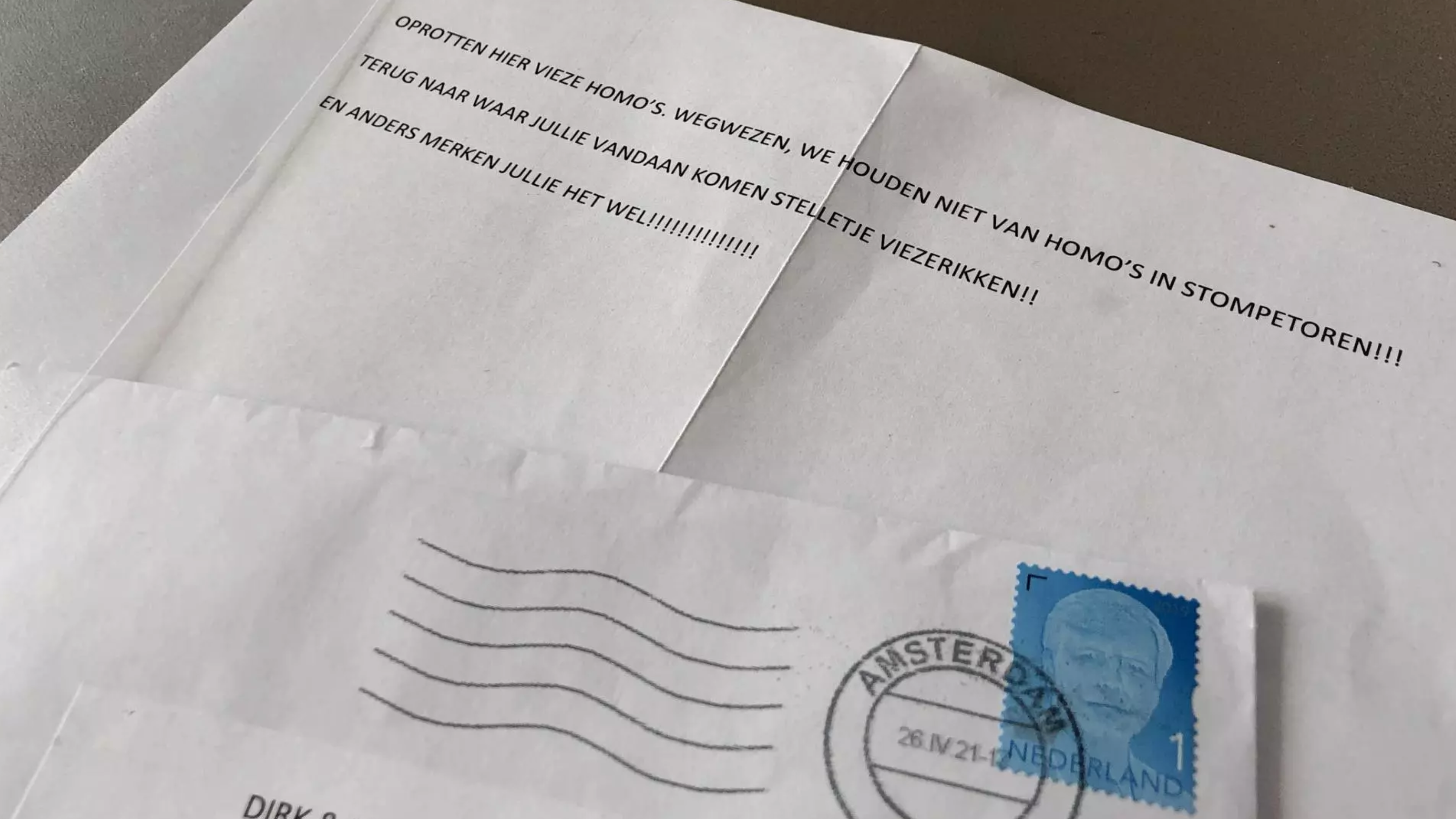 Toen hij afgelopen donderdagmiddag de post in Stompetoren bij elkaar grabbelde om thuis gezellig samen met Huub open te maken, had hij de brief met homofobe teksten dan ook niet verwacht. "Ik heb nog nooit negativiteit gevoeld over dat ik homo ben. Maar toen werd ik ineens als vies beticht. Als een viezerik."