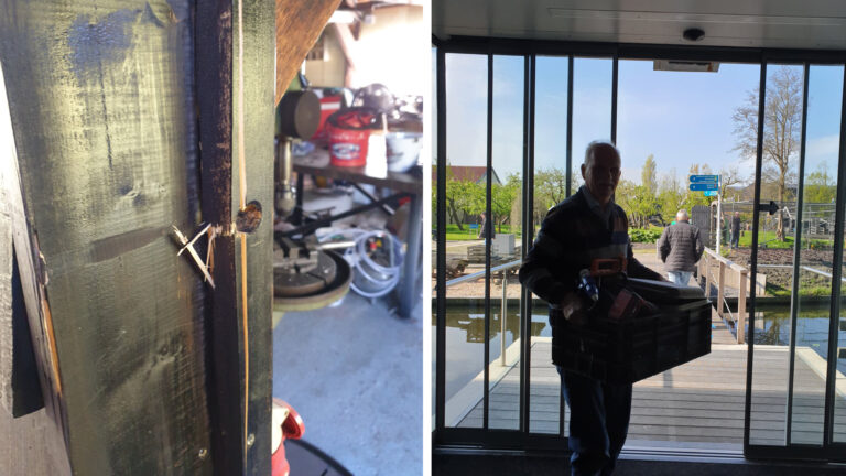 Nee, de man op de foto is niet één van de boeven. Het is vrijwilliger Guus die de kop niet liet hangen en naar huis was gelopen om een krat vol eigen gereedschap te halen. "Dan kunnen we in ieder geval aan de slag!"