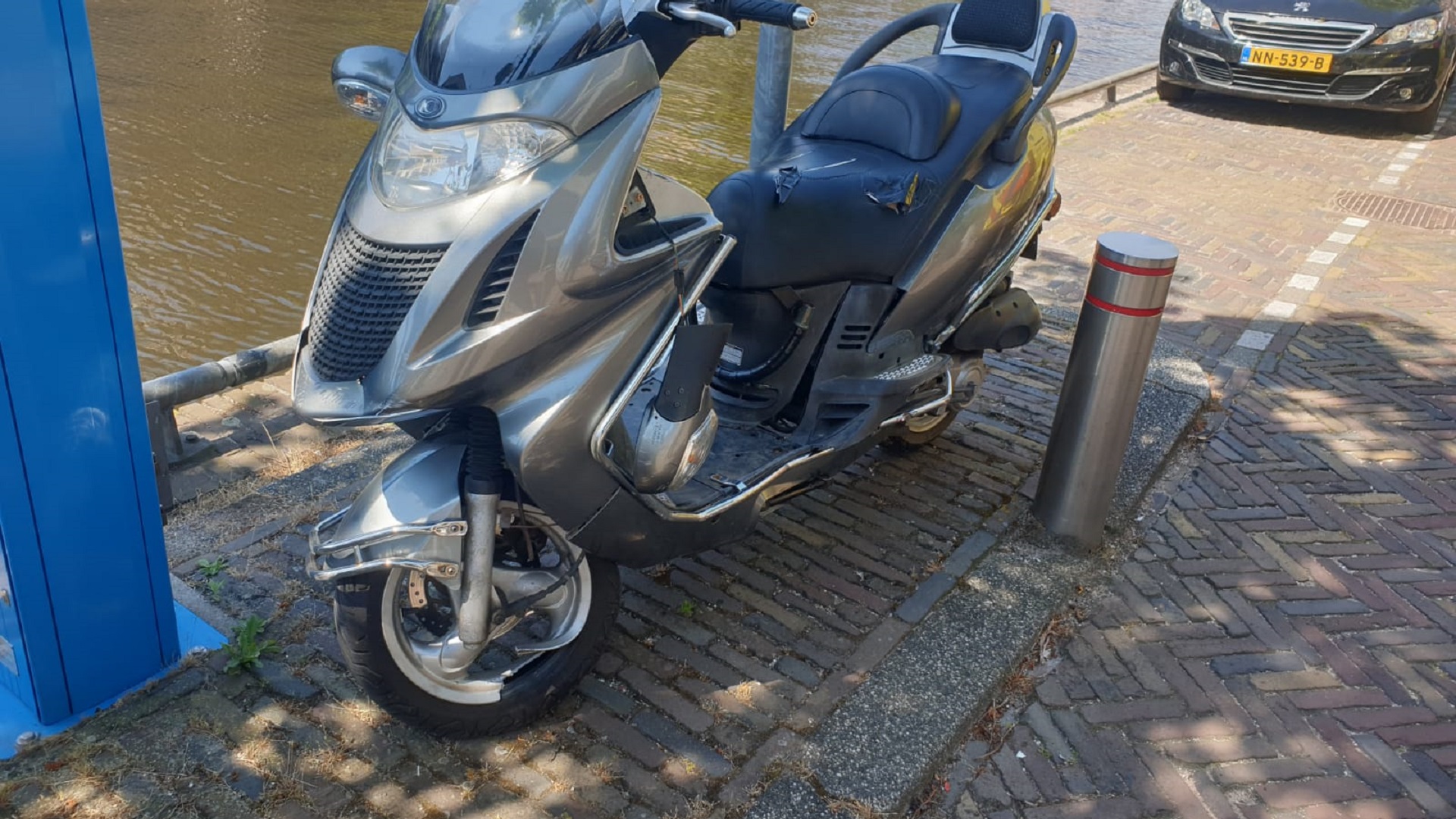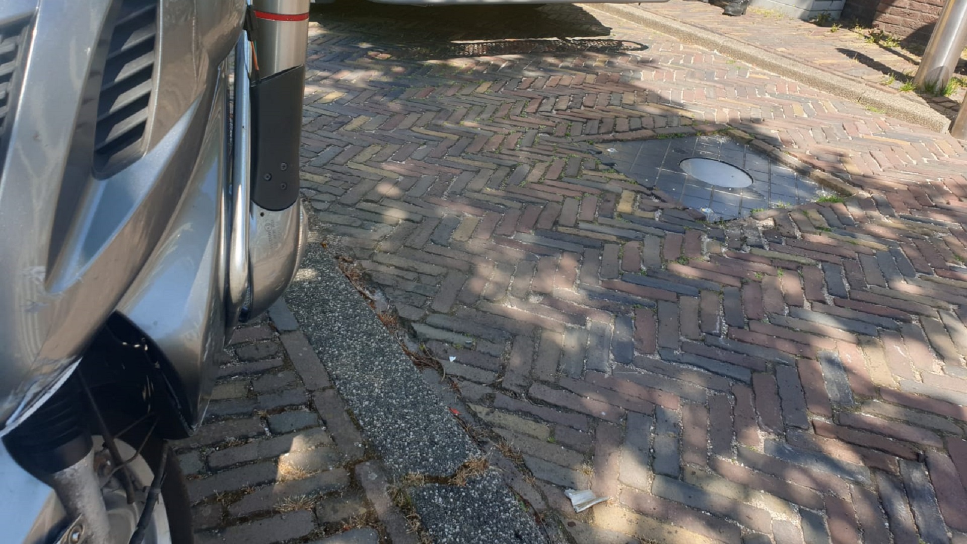 Wat er precies gebeurde is nog niet duidelijk. Vermoedelijk reed de man tegen de paal terwijl die net uit de grond omhoog kwam. De scooter is waarschijnlijk total loss. De velg van het voorwiel is gebroken, de voorvork is krom en een spiegel is afgebroken. (foto's: Inter Visual Studio)