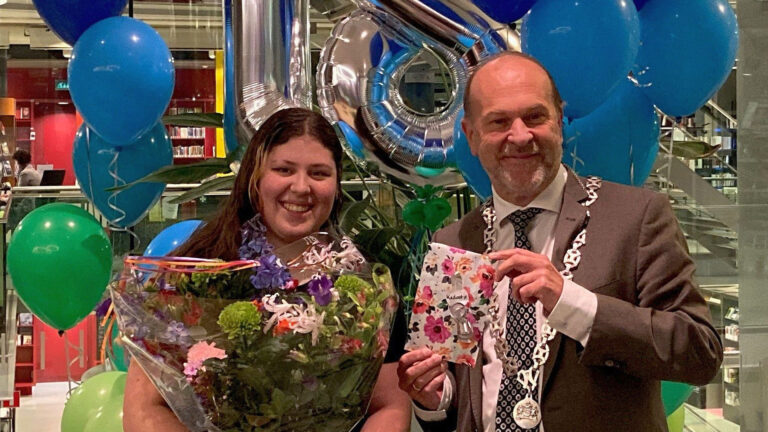Djamillah kon op haar 17e al stemmen vanwege de optie om vervroegd naar de stembus te gaan. Vandaag op de 24e is ze jarig. Dat weerhield burgemeester Blase er niet van om haar op het gemeentehuis te onthalen alsof ze al jarig was. In het gemeentehuis hingen ballonnen, waaronder een grote 1 en 8, en Djamillah kreeg een cadeautje.