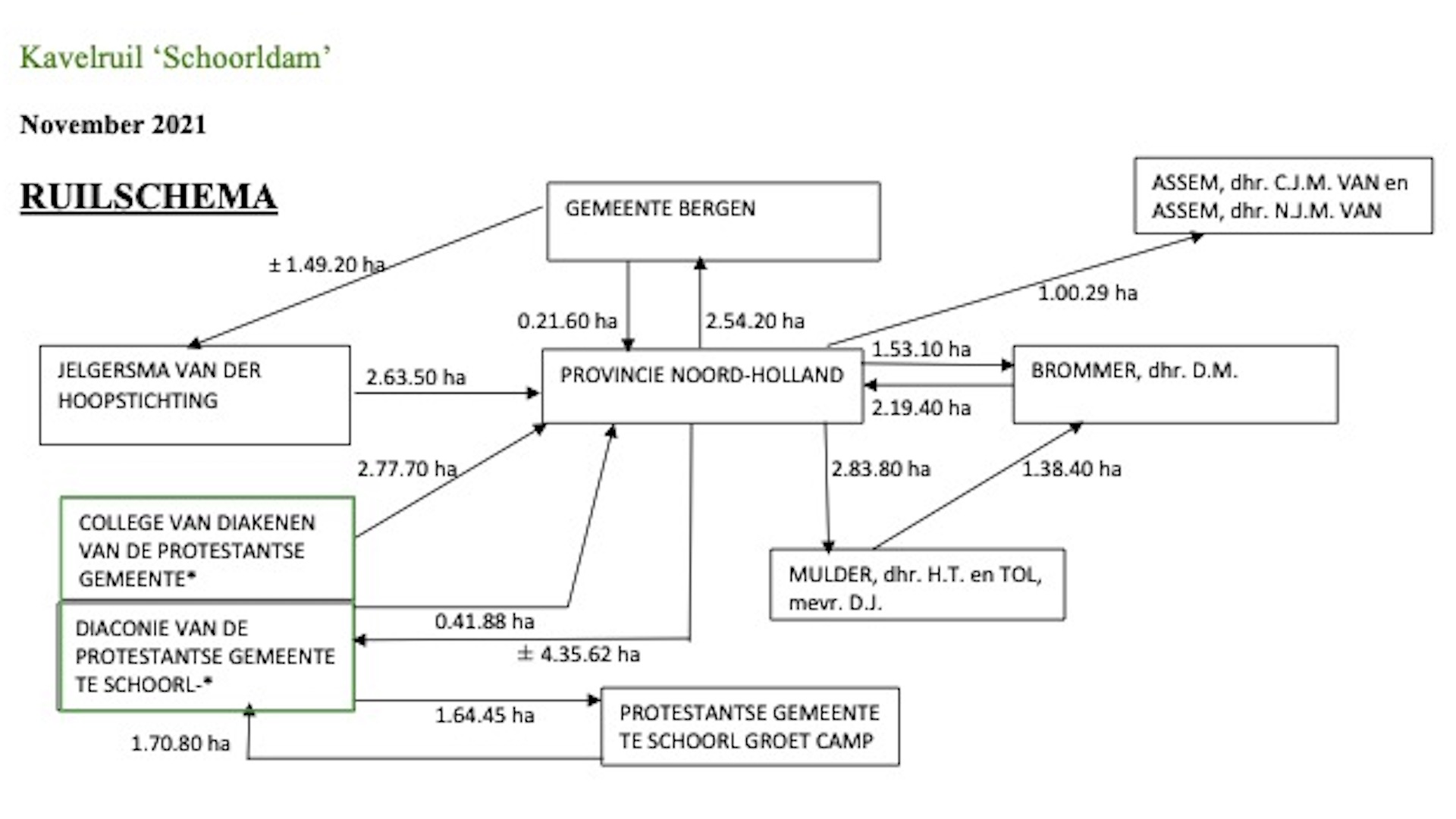 De protestantse kerkgemeenschap bracht enkele percelen in die minder gunstig waren gelegen, en kreeg daarvoor andere percelen terug die makkelijker kunnen worden verpacht. Onderling ruilen de protestanten ook wat landjes met elkaar. Daarnaast was er de nodige versnippering bij het natuurbeheer. Door de kavelruil krijgt de Jelgersma-Van der Hoop stichting het Geitenweidje in het Groene Hart van Schoorl, bij de jeu-de-boulesbaan. De stichting had al percelen die hieraan grenzen. Door de grondruil kunnen zij dat nu zien als één gebied. Gebiedsregisseur Monique Klaver heeft de eigenaar vervolgens in contact gebracht met Landschap Noord-Holland, dat dit gebied nu voor de stichting kan onderhouden. Ook de provincie heeft nu in een buitengebied een aaneengesloten Natuurnetwerk, waardoor de landschapswaarde verbeterd kan worden.