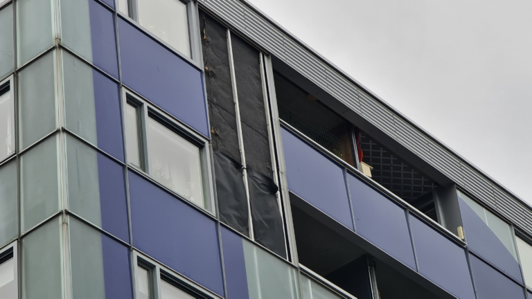De eerste grote schade die storm Eunice in regio heeft veroorzaakt is aan een pand aan het Tsjaarlingermeer in Heerhugowaard. Hier zijn twee gevelplaten van glas naar beneden gekomen. Ze vielen met een harde klap aan diggelen op de stoep beneden.