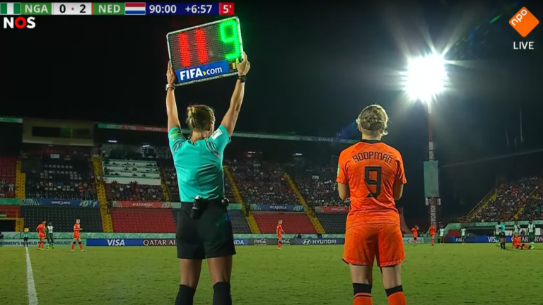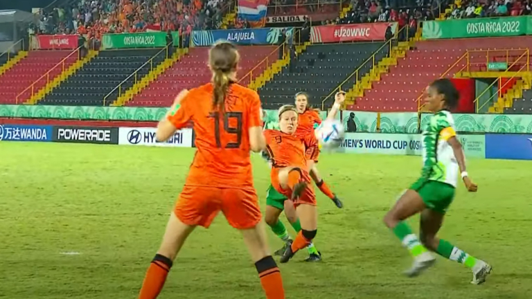 In de 98ste minuut was het tijd voor de wissel die Sanne Koopman uit Egmond aan den Hoef in het spel bracht. Zij kwam in de plaats van Ziva Henry, die in de 33ste minuut de 2-0 had gemaakt. Meteen stond Koopman bij een vrije trap op de goede plek in het strafschopgebied om de 3-0 binnen te wippen. Een katachtige beweging van de Nigeriaanse keeper Omini Oyono, die deed denken aan het roemruchte optreden van Daphne van Domselaar op het EK, weerhield de Egmondse van haar tweede doelpunt op een WK. (foto: screenshot NOS)