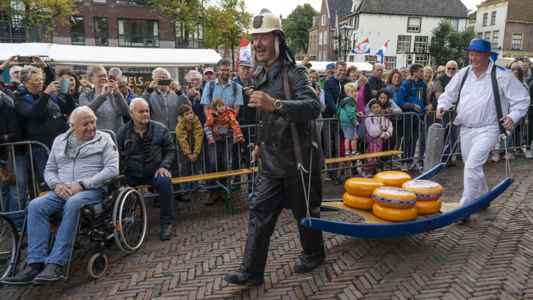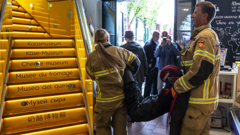Het was voor de nietsvermoedende bezoekers van de kaasmarkt een beetje een vreemd gezicht: een in een antieke outfit gestoken brandweerman die met een berrie met kazen rondliep. Het bleek niet de nieuwste toeristische trekker, maar het ludieke afscheid van Ruud Karsten, die er 30 jaar brandweer op heeft zitten.