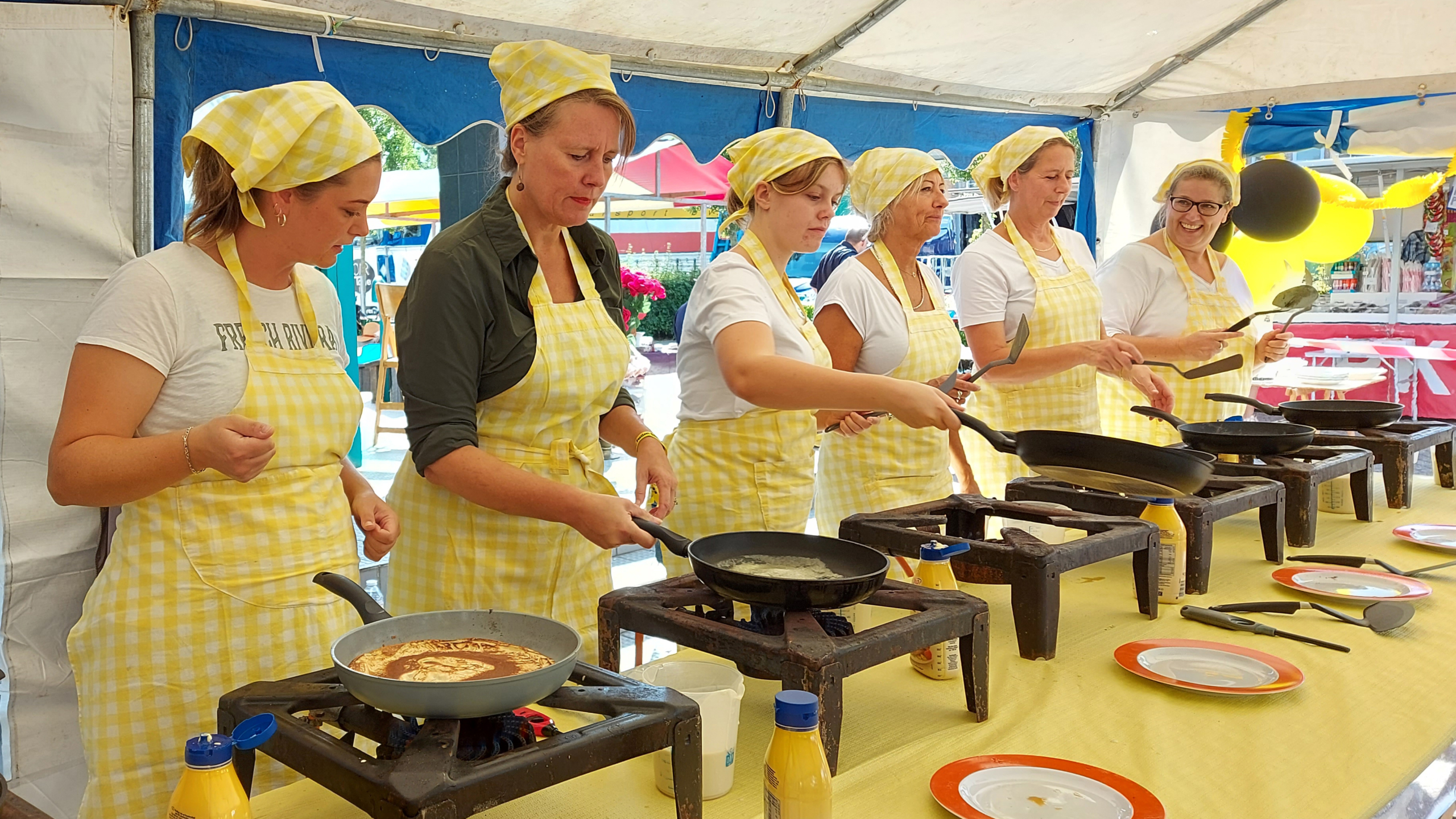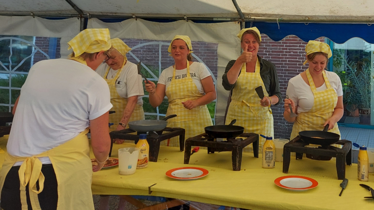 Zingend en dansend bakken de vrijwilligers de pannenkoeken die gretig aftrek vinden bij de bezoekers. Burgemeester Anja Schouten kreeg eerst een rondleiding en, ging onder meer met  bewoners in gesprek en bekeek oude foto's van het dorp.