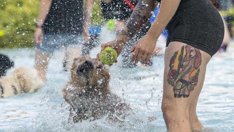 Traditioneel is het buitenseizoen bij zwembad Hoornse Vaart afgesloten met een 'hondenplons'. Tientallen baasjes kwamen zondag met hun hond naar het Alkmaarse zwembad om zich een middag te leven in en om het water, en op de vlotten die in het water lagen. Op een paar honden die echt geen zin hadden na, vermaakte iedereen zich uitstekend.