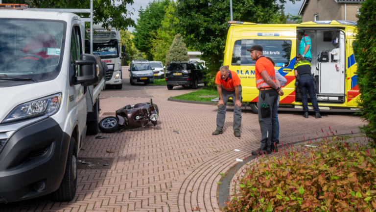 Wat de oorzaak van de botsing is, is nog niet duidelijk. Het lijkt echter voor de hand te liggen dat er een voorrangsfout is gemaakt of dat één van beide verkeersdeelnemers de ander over het hoofd heeft gezien. De scooterrijder kwam bij het ongeval hard ten val en liep daarbij verwondingen op aan zijn hoofd en nek. Hij is met een ambulance overgebracht naar het ziekenhuis. (Foto's: Inter Visual Studio)