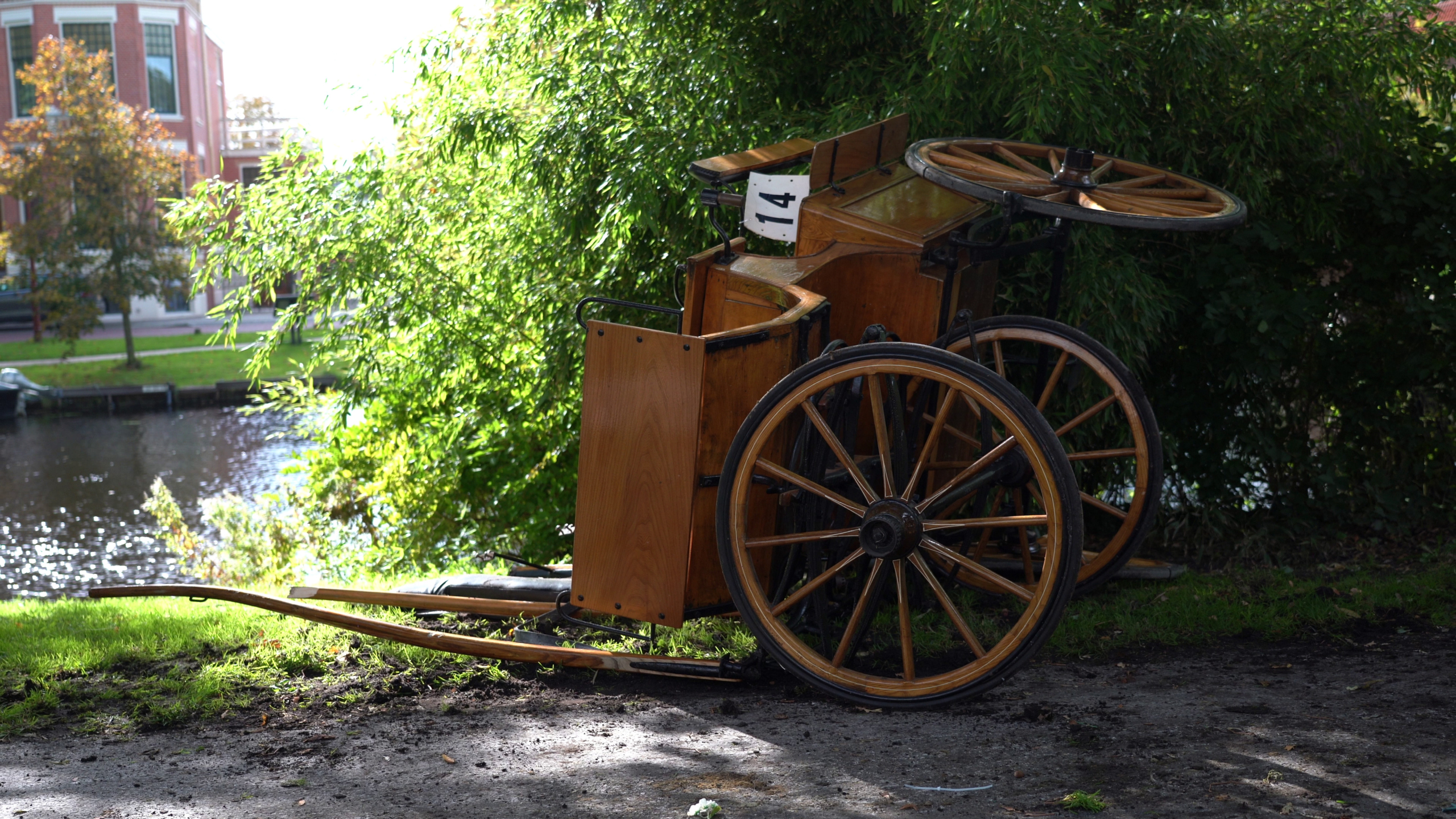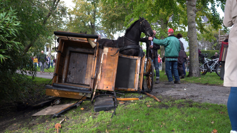 Als het tweespan achter een boom blijft haken, rukt het paard zich los en draaft richting andere wachtende deelnemers. "Het paard is toen ingereden op een andere koets, maar wonder boven wonder was er geen sprake van menselijk of dierlijk leed."