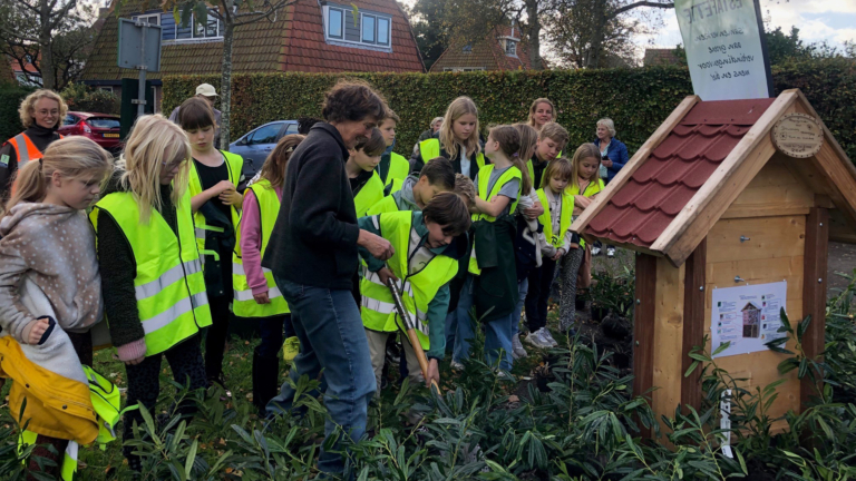 Toen alle planten en struiken in de grond zaten kregen alle deelnemers een zakje biologische bolletjes van Hortus Alkmaar mee naar huis.