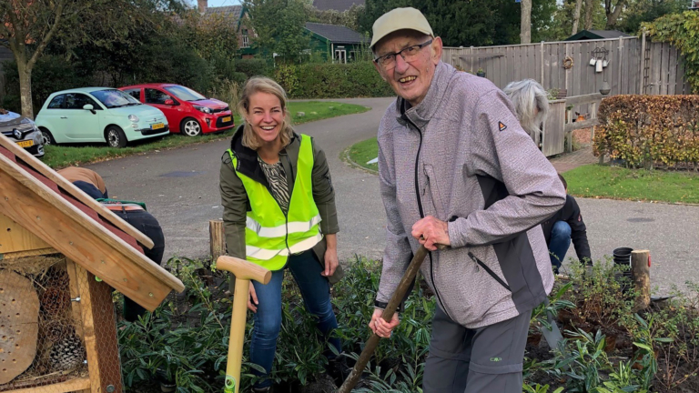 Leden van de buurtvereniging en leerlingen van groep 8 van de Matthieu Wiegmanschool kwamen in de school bij elkaar voor een gezellige start. Ineke Wynia van Landschap Noord- Holland vertelde over de plantensoorten voor de border, zoals de blauwbloeiende smeerwortel, een inheemse plant waar vooral hommels dol op zijn. Daarna gaven de leerlingen met de ‘startschop’ het startsein. Ook buurtbewoners staken enthousiast de groene vingers uit de mouwen, waaronder een 90-jarige, die het naar eigen zeggen geweldig vond om met de kinderen samen te werken.