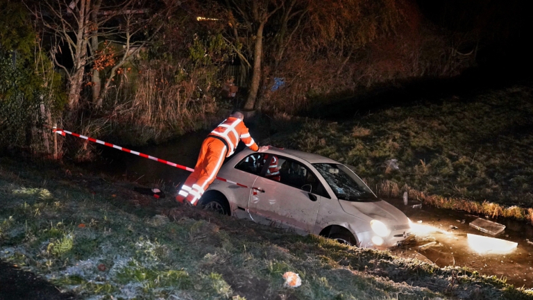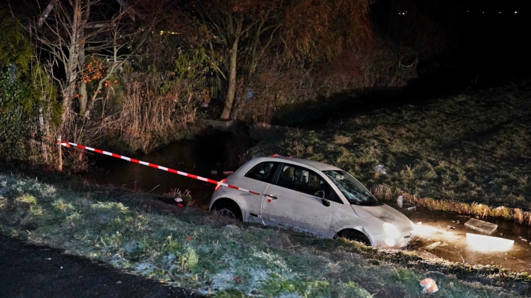 Vanwege het spekgladde wegdek is met de gealarmeerde berger overlegd en is vanwege de veiligheid besloten de auto pas later uit de sloot te halen en af te voeren.