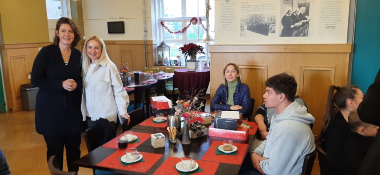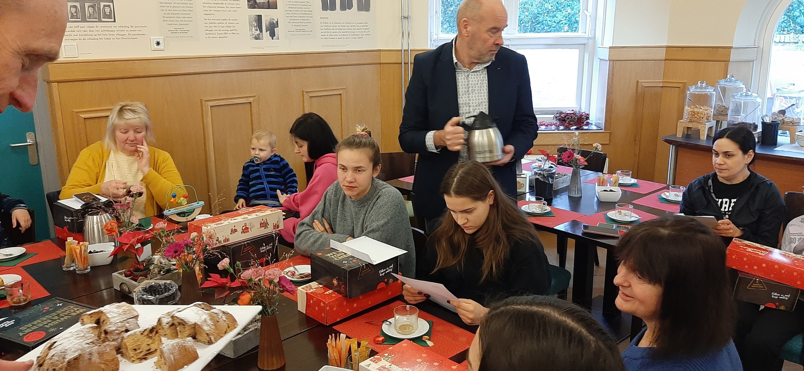 Burgemeester Mascha ten Bruggencate en wethouder Ronald Vennik waren aanwezig bij de gezellige ontmoeting. Als kleinigheidje om mee te nemen kregen de Oekraïners ook nog een traditionele Nederlandse kerststol.