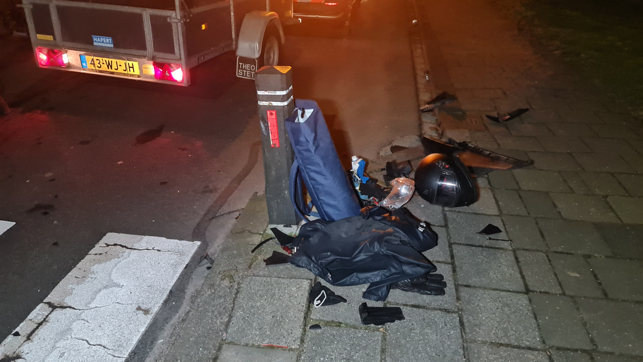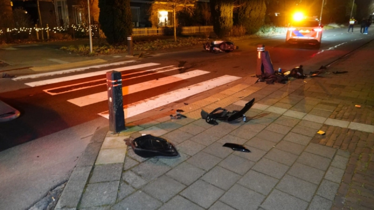 Hoe het komt dat de scooterrijder de paal bij versmalling ramde is niet duidelijk. Zijn scooter is in ieder geval aan gort. De weg lag bezaaid met brokstukken en de motor lekte vloeistof. De politie heeft het voertuig meegenomen, vermoedelijk om te kijken hoe hard het ding kan rijden. De weg was enige tijd afgesloten vanwege het ongeval en de afhandeling. (foto's: Inter Visual Studio)