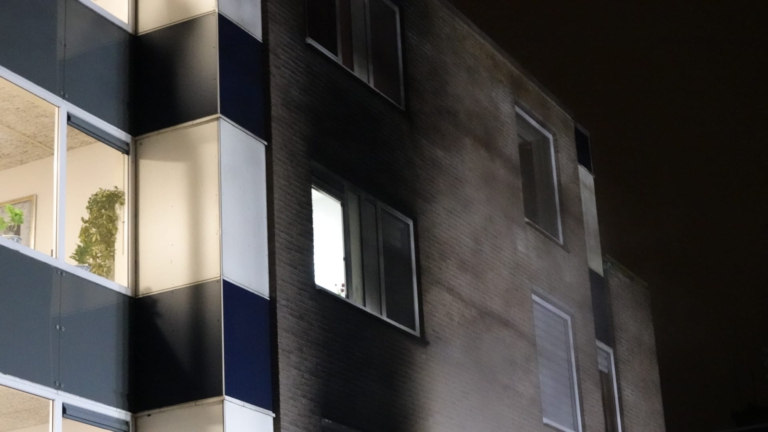 Het duurde niet lang voordat de scooter geblust was, maar voor de zekerheid waren de bewoners van de bovengelegen appartementen al naar buiten gestuurd. De roetaanslag is stille getuige van hoe hoog de vlammen kwamen. Na inspectie van de vier ontruimde appartementen mochten de bewoners weer terug naar binnen.