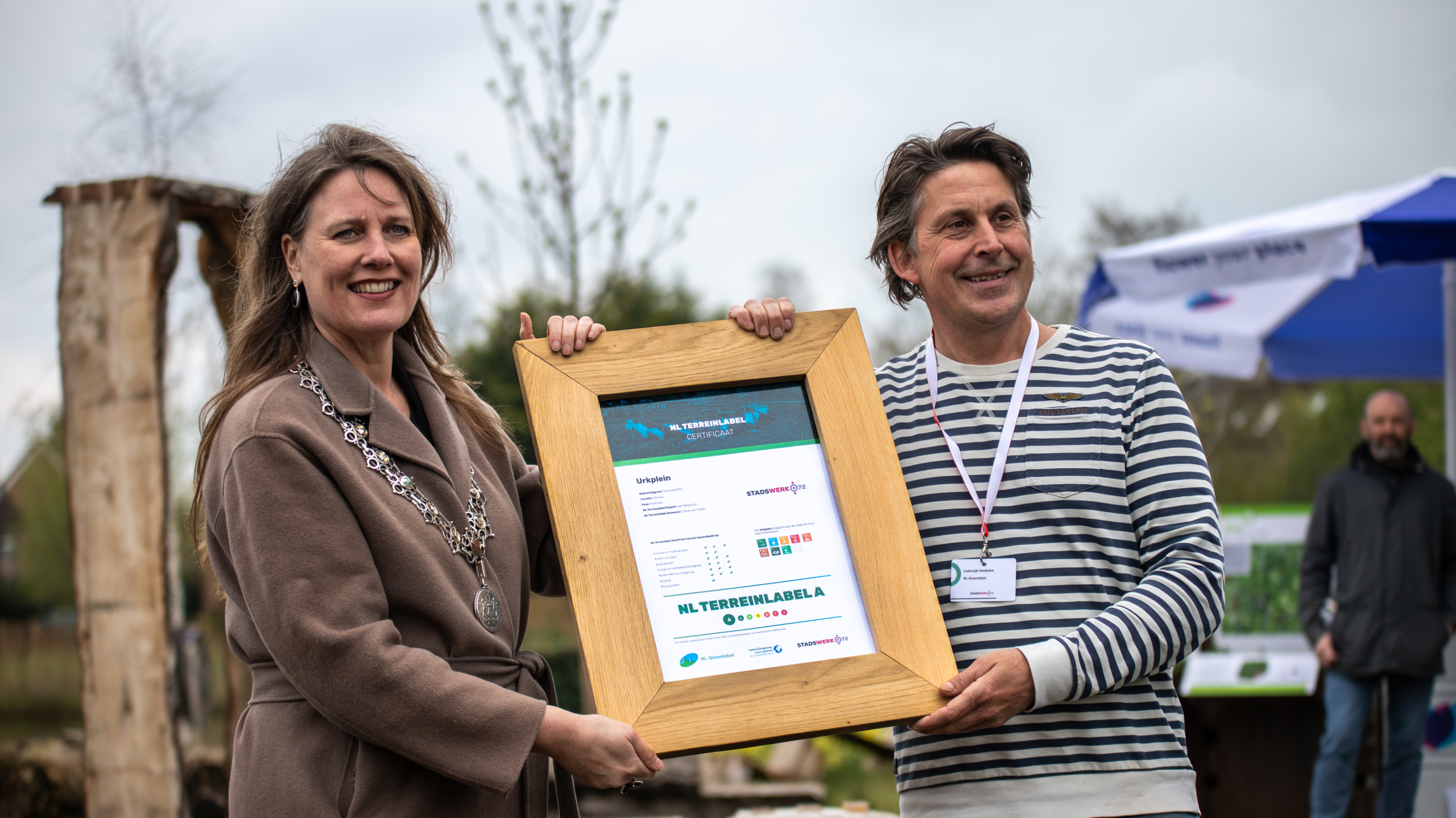 Goed voor de biodiversiteit dus en makkelijk te onderhouden, want maar één keer per jaar moet de maaier er overheen. Niet het enige praktische punt waar het park op scoort, want zo'n groen park heeft veel meer voordelen. Zo kan na een hevige regenbui het water beter weg en wordt het er tijdens een zomerdag, nu de de donkere stenen verdwenen zijn, niet meer zo ongelofelijk heet. Het park heeft nog iets bijzonders. Een NL green label. "Dat is een label voor de leefomgeving om duurzaamheid meetbaar te maken", legt Lodewijk uit. "We kijken onder andere naar biodiversiteit, beheer, de impact op het klimaat en de gebruikte materialen. Zo stond er bijvoorbeeld een prachtige, maar zieke kastanje. Deze hebben ze daarom moeten omhakken. Van het hout hebben ze meubilair gemaakt dat nu in het park staat."
