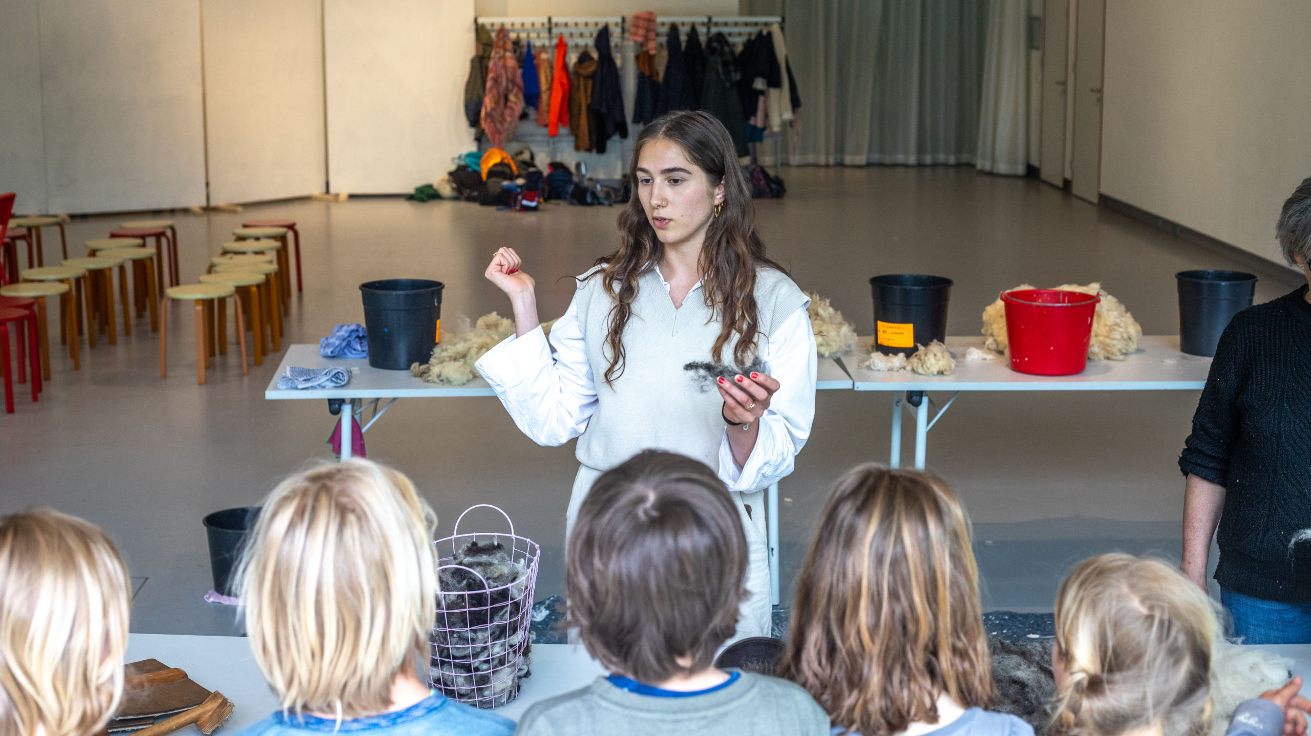 Terwijl er buiten schapen rondlopen, is er binnen in elke hoek wel iets anders te zien: tafels met wol, blikken met natuurlijke verf en badjes om de wol in te wassen. Met behulp van uitleg van experts, van wat ze zelf zien en natuurlijk met behulp van hun handen leren de leerlingen stap voor stap hoe ze op een duurzame manier producten kunnen maken van wol. Dit is bijzonder belangrijk, legt Lonneke Metselaar uit, omdat de waarde van wol tegenwoordig niet meer wordt erkend. "In Nederland wordt wol eigenlijk als afval behandeld en verbrand, terwijl onze wollen truien uit Nieuw-Zeeland komen."