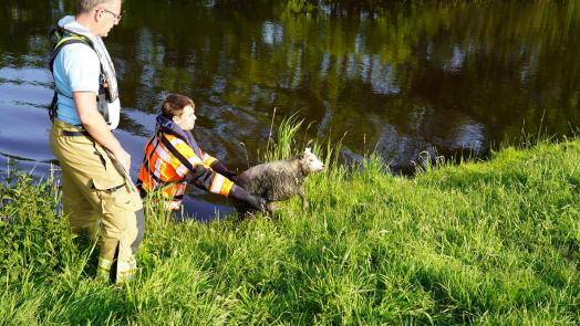Na te zijn gered door de brandweer kon het geschrokken schaap snel weer worden herenigd met de andere schapen op het aangrenzende weiland.