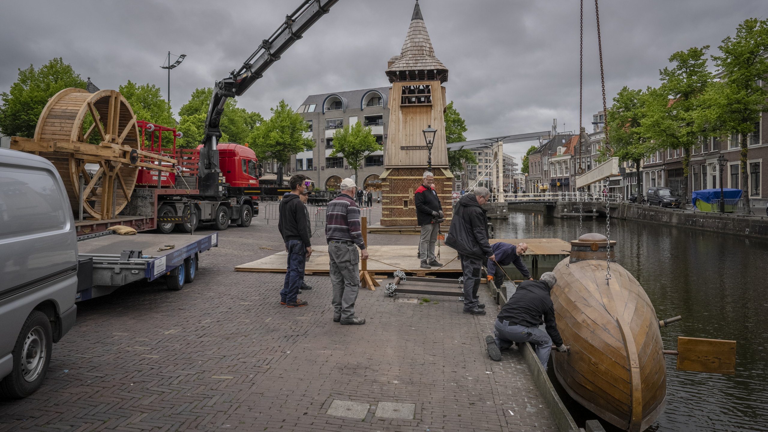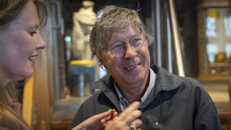"Het wordt nog wat om hem boven te krijgen," grappen de aanwezigen op de borrel. Want iedereen weet: eigenlijk gaat het vandaag om hem. Maar dat is wel geheim. "Ik kom voor de huldiging," zegt iemand bij de trap beneden. "Sst! Laten we het gewoon een borrel noemen." Door het raam is te zien hoe Roobeek boort aan één van de stellages van Kaeskoppenstad. Naast hem de bekende klokkentoren, de lijnen ietwat vertekend door het oude glas-in-lood van het Waaggebouw.