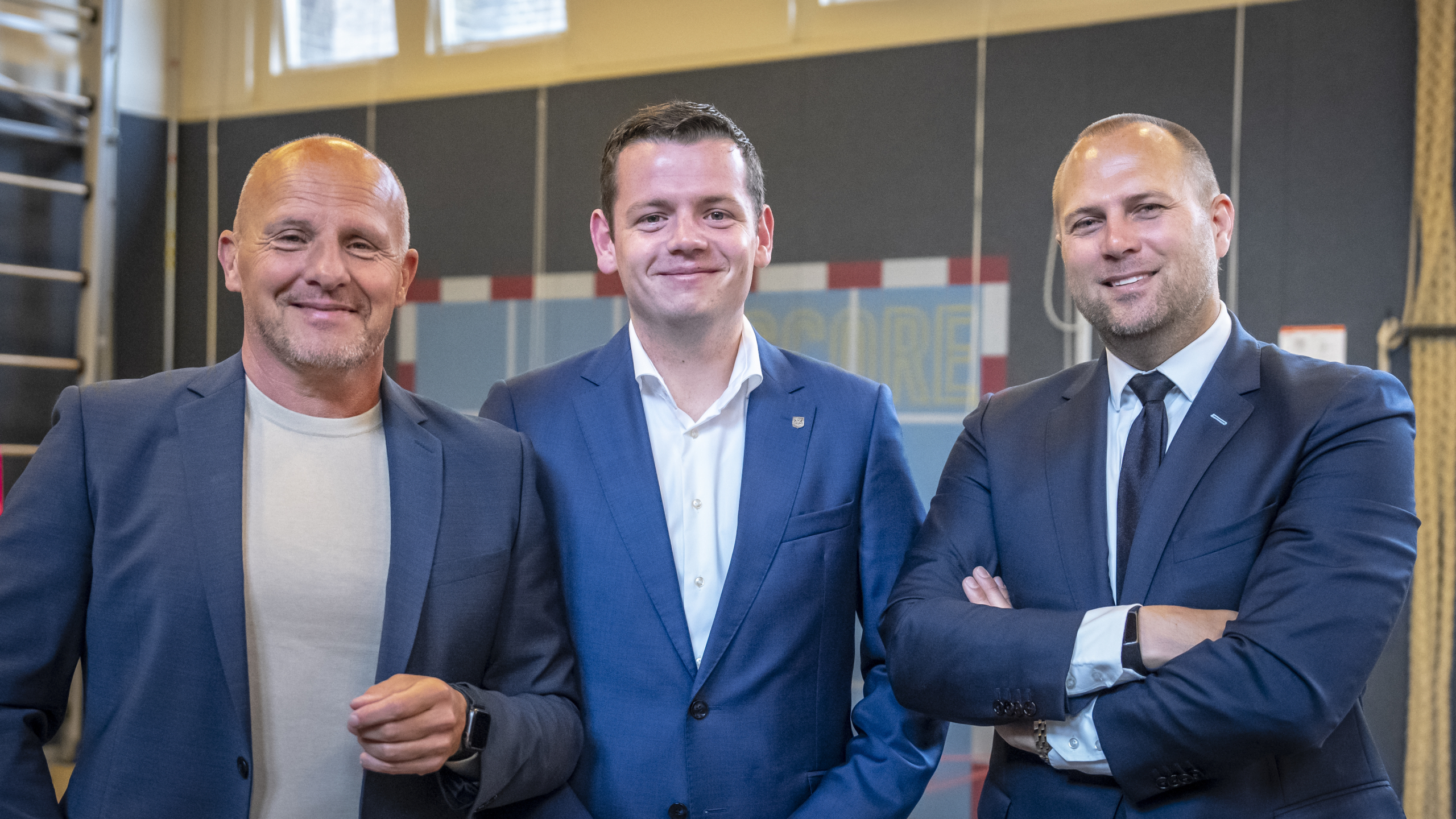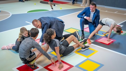 Peetoom zat vroeger zelf op het Sint Adelbertus en gymde daar op een houten vloer met traditionele belijning. Weinig mis mee, maar deze ASM-gymzaal vindt hij toch wel een stuk interessanter. "Super mooi dat jullie dit hebben, ik denk een trotse directeur op deze school", zegt hij, terwijl hij zich even richt tot directeur Michael Vader. "Dat hebben jullie supermooi gedaan. Daarvoor complimenten." Tegen de kinderen zegt hij: "En ja, voor jullie belangrijk dat het gewoon supermooi is."