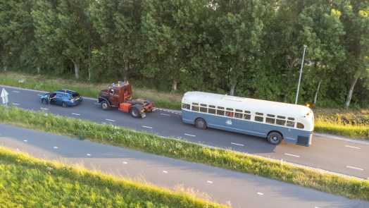 Zelf rijden deed de stofzuigerbus nog niet. Er zit weliswaar een werkende motor in, maar die kan op dit moment nog niet worden gebruikt. Dat heeft met de versnellingsbak te maken, zo was eerder te lezen op Duinstreek Centraal. Om vooruit te komen was een truck nodig, die er overigens nauwelijks minder karakteristiek uitzag. Het treintje van truck en bus arriveerde na een kort ritje in de Dorpsstraat.
