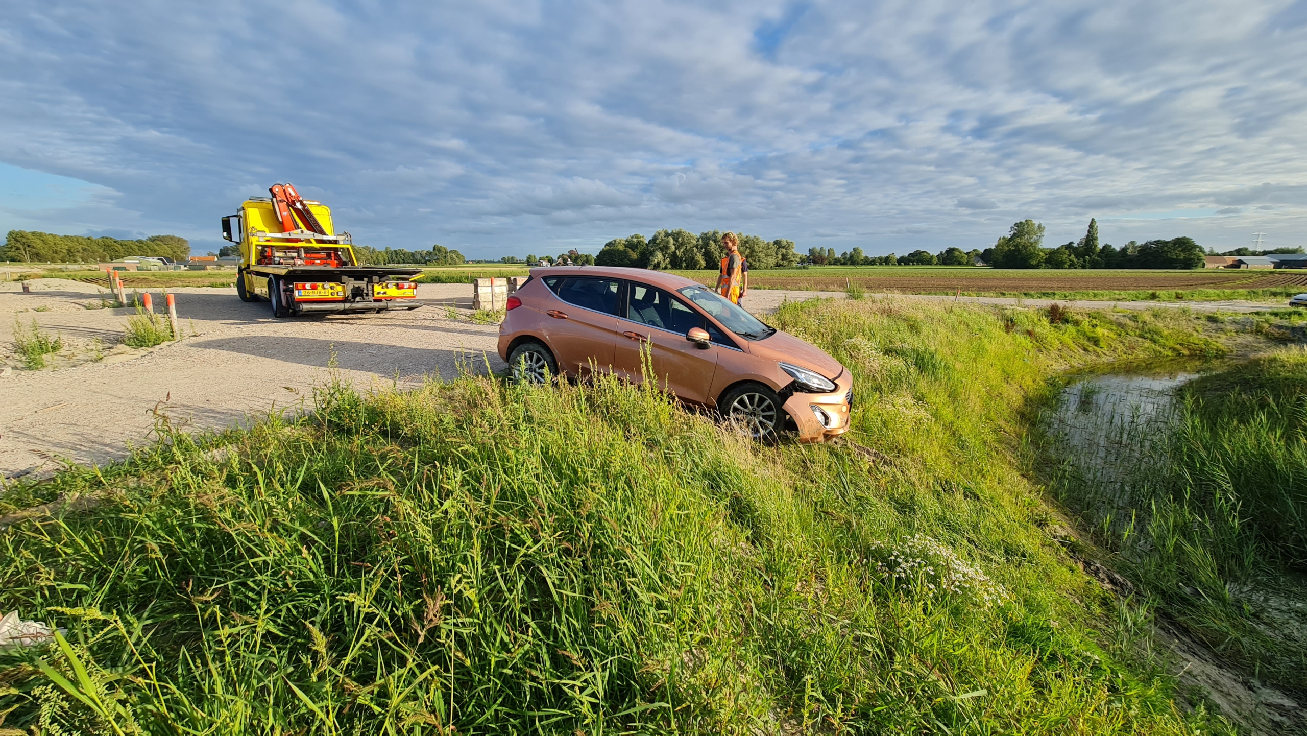 De vrouw kwam vanaf de Skarpeterweg en botste tegen een auto die al op de provinciale weg reed. Het gevolg was dat haar wagen via een zandbult in een sloot aan de overkant van de weg belandde. Vermoedelijk is een inschattingsfout de oorzaak van het ongeluk. Een bergingsdienst is ter plaatse gekomen op de provinciale weg in Heerhugowaard en heeft de wagen meegenomen.