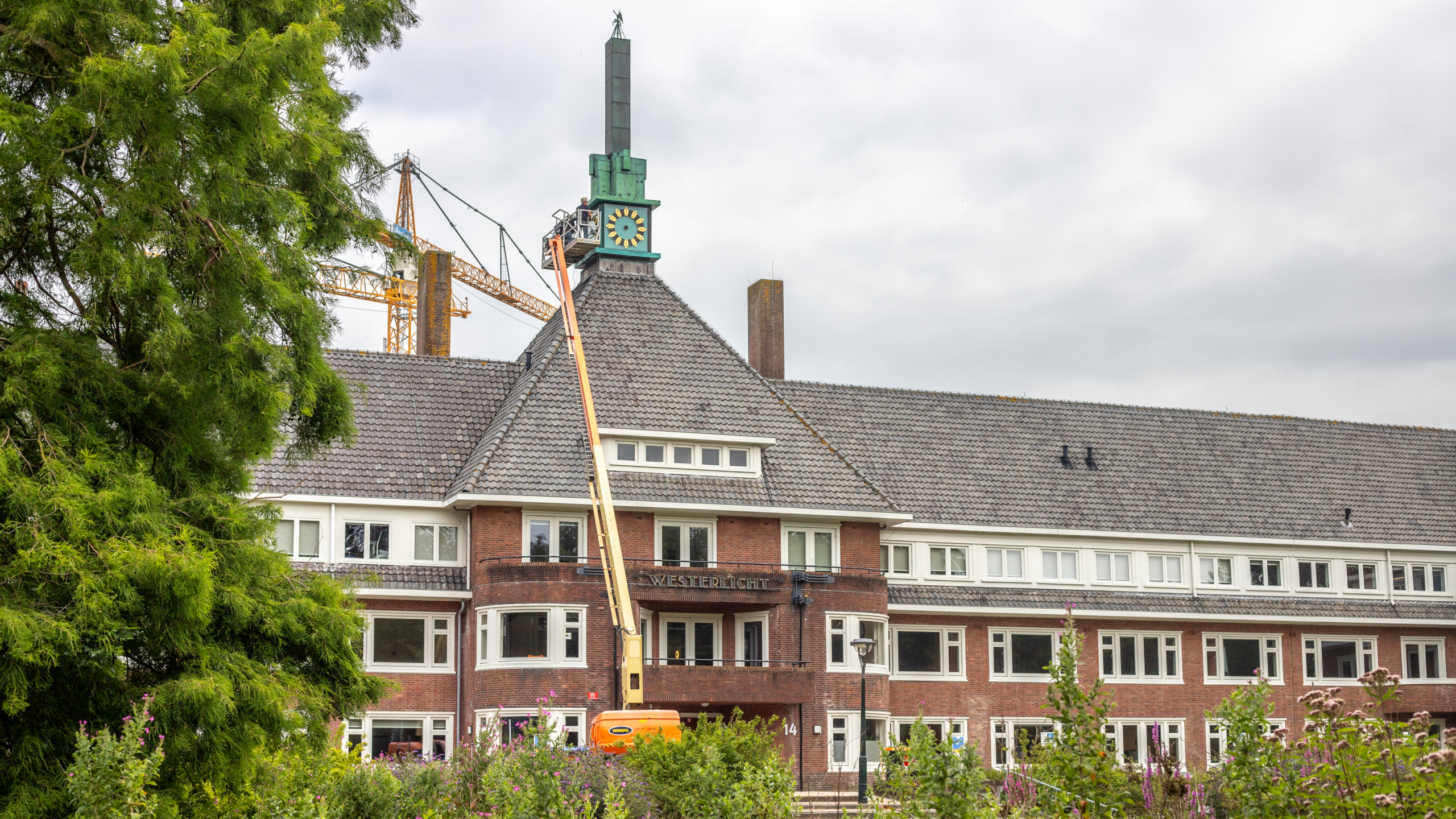 Voor het eerst sinds tijden is te zien hoe laat het is. (foto: Alkmaar Centraal / Youri Hoeben)Dat de klok weer werkt is bijzonder, want de torenklok van Westerlicht heeft meer dan 20 jaar stilgestaan. "Toen we aan de opknapbeurt begonnen troffen we een heel vreemd uurwerkje aan", herinnert Stiensma zich. "Veel te klein ook. Ik denk niet dat dat gewerkt heeft, om eerlijk te zijn. Die klok stond echt al heel lang stil." In 2001 zou er een 'wisseling van de wacht' zijn geweest, weet Stiensma, maar hij denkt dat de klok ook voor die tijd al stil heeft gestaan.