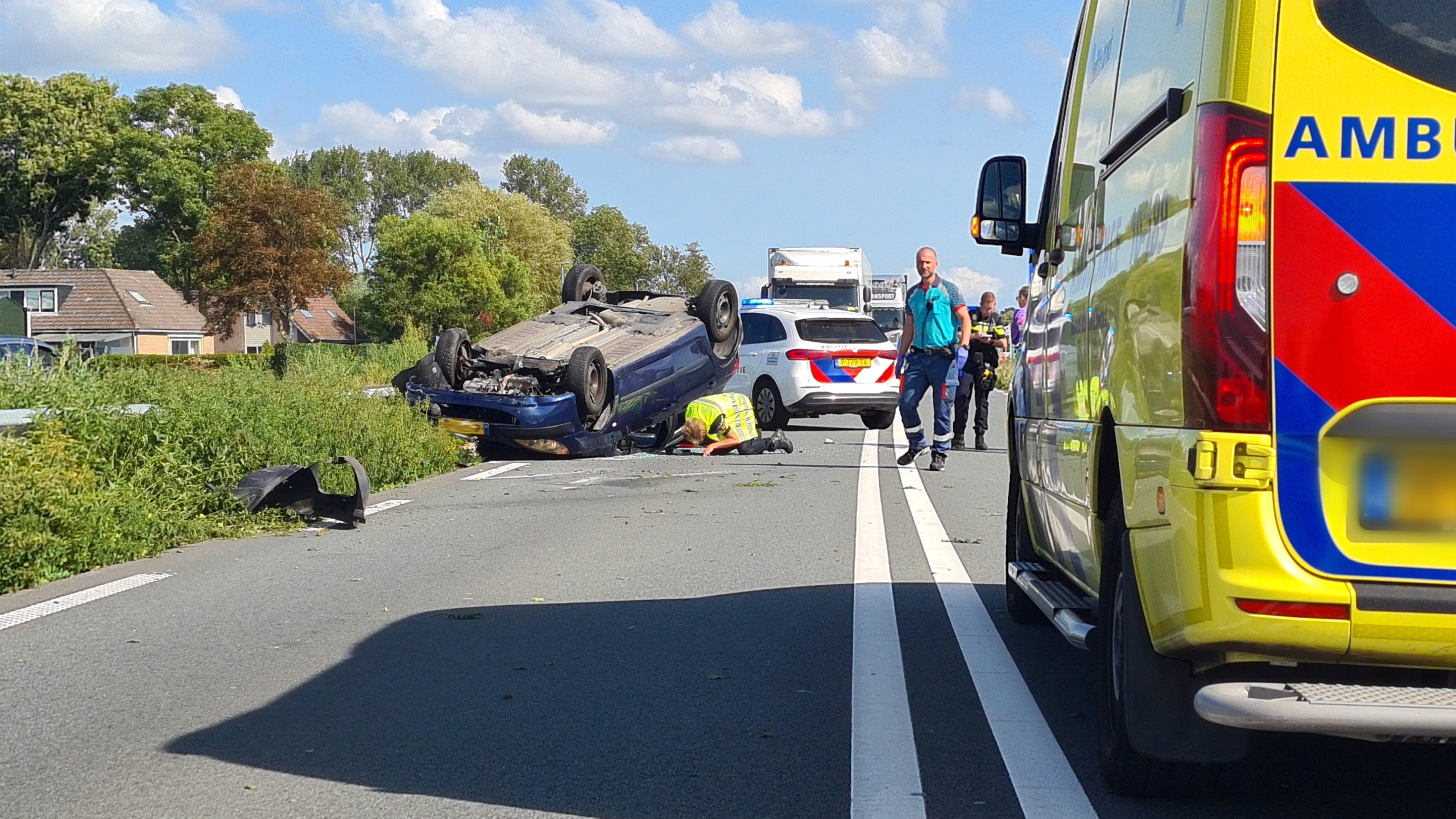 Een auto over de kop, veel schade en de ambulance ter plaatse: dat was de situatie maandagmiddag op de N194 ter hoogte van het Geveland bij Obdam. Het eenzijdige ongeval zorgde ervoor dat beide rijstroken van de weg werden afgesloten, met de nodige vertraging tot gevolg.