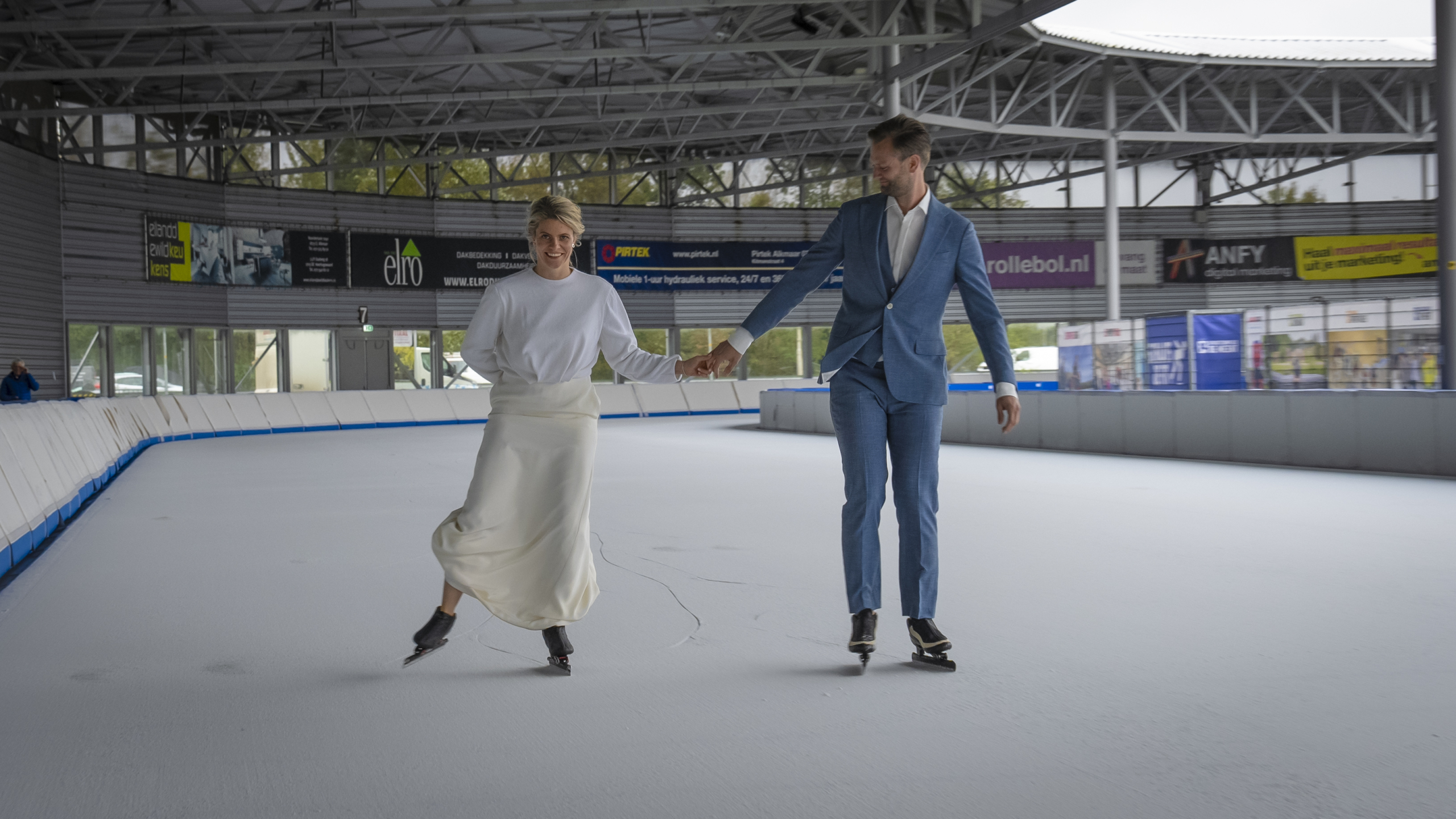 "Dit is geweldig voor ons", vertelt bruidegom Coen Koning. "Maar ja, hoe vraag je zoiets?", vervolgt bruid Annemaartje van Strien. "We hebben maar een mailtje gestuurd met daarin "Dit is misschien een rare vraag hoor, maareh..., we hoopten natuurlijk dat De Meent ook wat zag in het plan." En dat bleek het geval. Dus werd, nog voor de officiële seizoensopening volgende week, de baan gereserveerd voor het bruidspaar. Met trouwjurk aan stapt Annemaartje op de ijzers. "Heb je het niet koud?", vraagt de Streekstad Centraal verslaggever. "Nee, valt wel mee hoor." Coen lacht: "Vandaag maakt het niet uit." (tekst gaat verder na de foto)