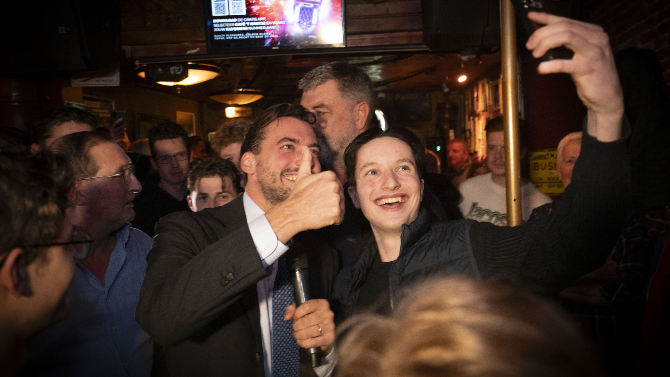 Baudet voor de camera van RTL Nieuws. (foto: Marco Schilpp)Dat er ook veel jongeren aanwezig waren zou volgens FvD een positief signaal zijn, al werd net deze week bekend dat meer dan de helft van de kiesgerechtigden ouder is dan 50 jaar. In de peilingwijzer, die een gemiddelde van verschillende peilingen laat zien, staat FvD op drie tot vijf zetels. De verkiezingen zijn volgende week woensdag.
