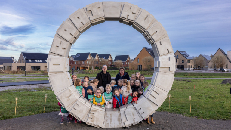 Het valt op. Sterker nog: je kan er bijna niet omheen. Het kunstwerk schuin achter school De Nieuwe Draai in Heerhugowaard. De sculpturale ‘ring’ met de letters ‘Kunst met een Draai’ is niet alleen een werk, maar ook een plaats om te zitten en elkaar te ontmoeten. Het beeld is officieel onthuld. In het bijzijn van kunstenaar Martijn Sandberg, wethouder Annette Groot en de kinderen van school De Nieuwe Draai.