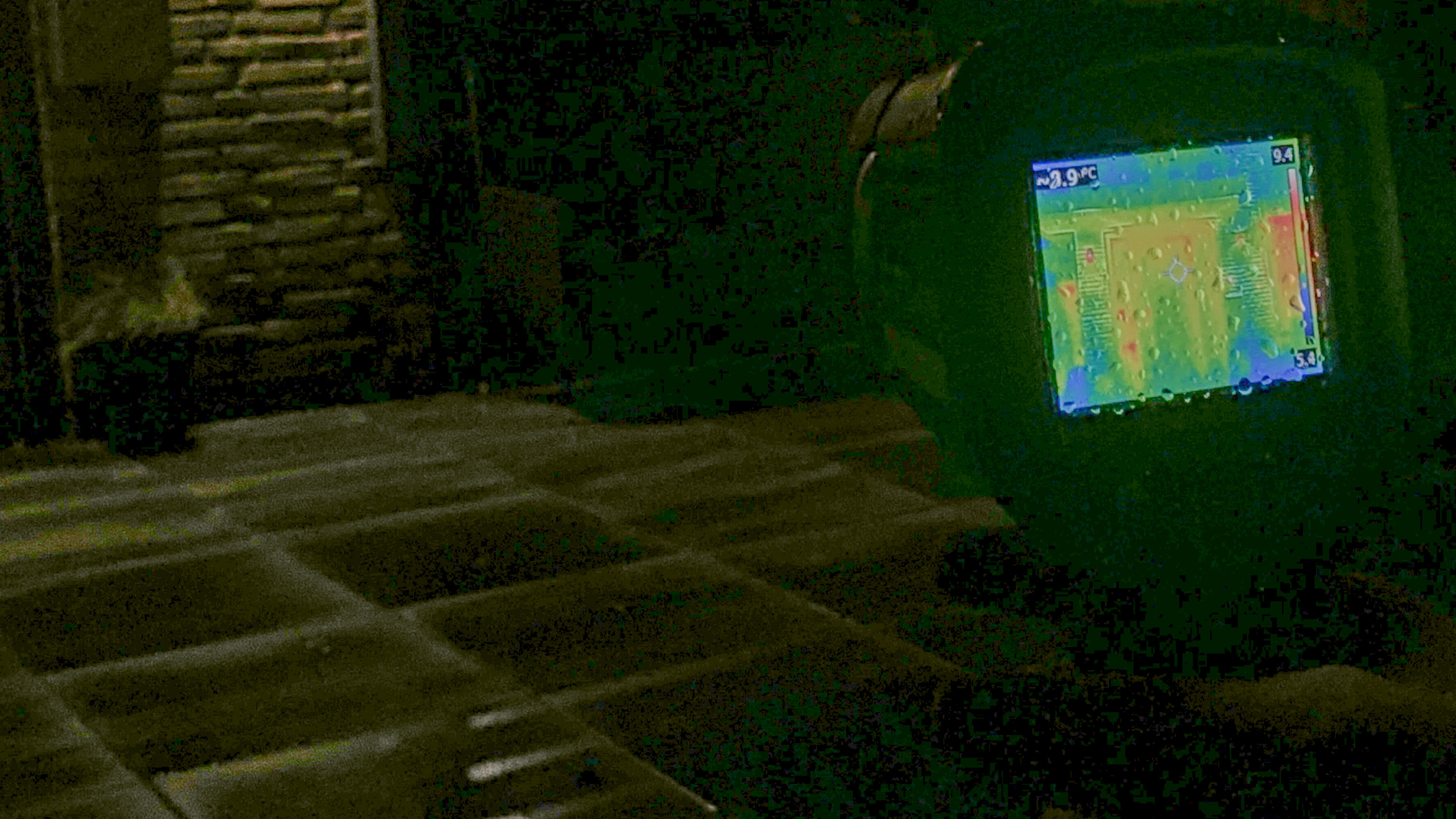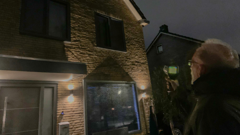 "Zo zie je maar, een huis kan altijd nog duurzamer", zegt een buurtbewoonster tegen Streekstad Centraal. Dat is precies wat de initiatiefnemers van de wandeling willen laten zien. "Kijk, je ziet dat het bij de warmtepomp blauw kleurt en dat de leidingen rood zijn", vertelt buurtbegeleider Cees Warmer van Stichting Buurkracht. Hij wijst op het scherm van zijn infraroodcamera. (Tekst gaat verder onder de foto)