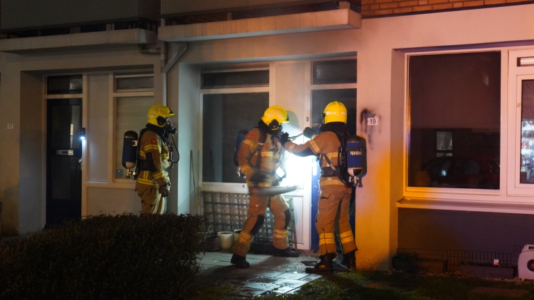 De brandweer in actie.De brandweer probeerde snel vast te stellen of er iemand in de woning aanwezig was, de rook kwam toen al uit de brievenbus. Er werd gebonsd op de ramen, maar er verscheen niemand aan de deur. Toen ramde de brandweer de voordeur in om zich zo toegang tot de woning te verschaffen. Daar bleek niemand thuis.
