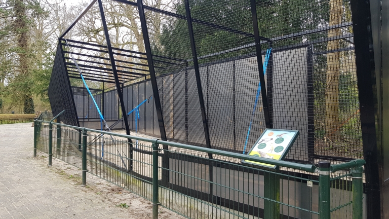 De laatste weken is daarom maar verder gewerkt aan het lage deel van de volière. "Het dak en het gaas worden op dit moment geplaatst. Binnenkort beginnen we met het maken van de gang aan de achterkant van de volière. Via deze gang kunnen medewerkers bij de vogels komen." (tekst gaat verder onder de foto)