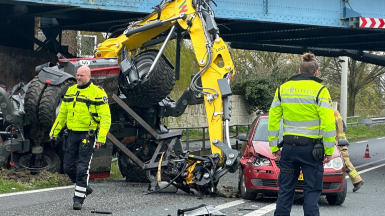 Een ravage bij de spoorbrug over de N242 in Heerhugowaard. Woensdagochtend is een vrachtwagenchauffeur met een te hoge lading tegenaan gereden. Deze keer ging het om een hijskraan, die door de klap van de oplegger viel en daarbij een achterligger raakte.