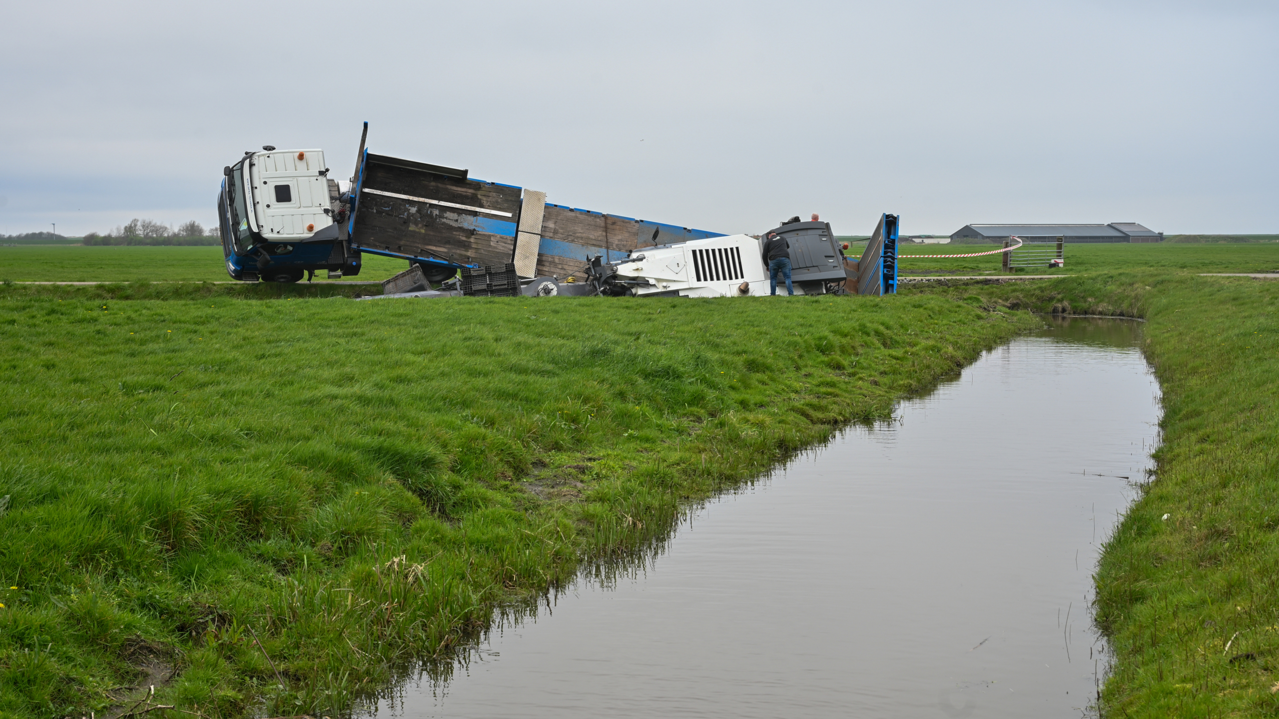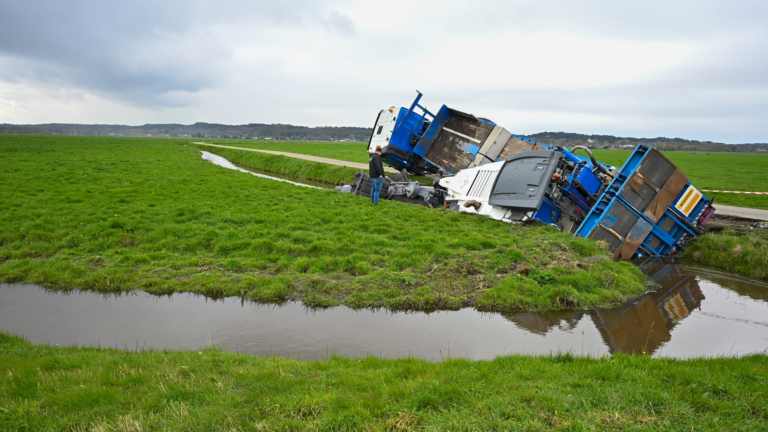De eerste melding van het ongeluk werd even voor 11:30 uur gedaan, waarna de hulpdiensten snel ter plaatse waren. Het vermoeden bestaat dat de wagen met dieplader met de wielen in de berm is gekomen nam en daarna te water raakte.