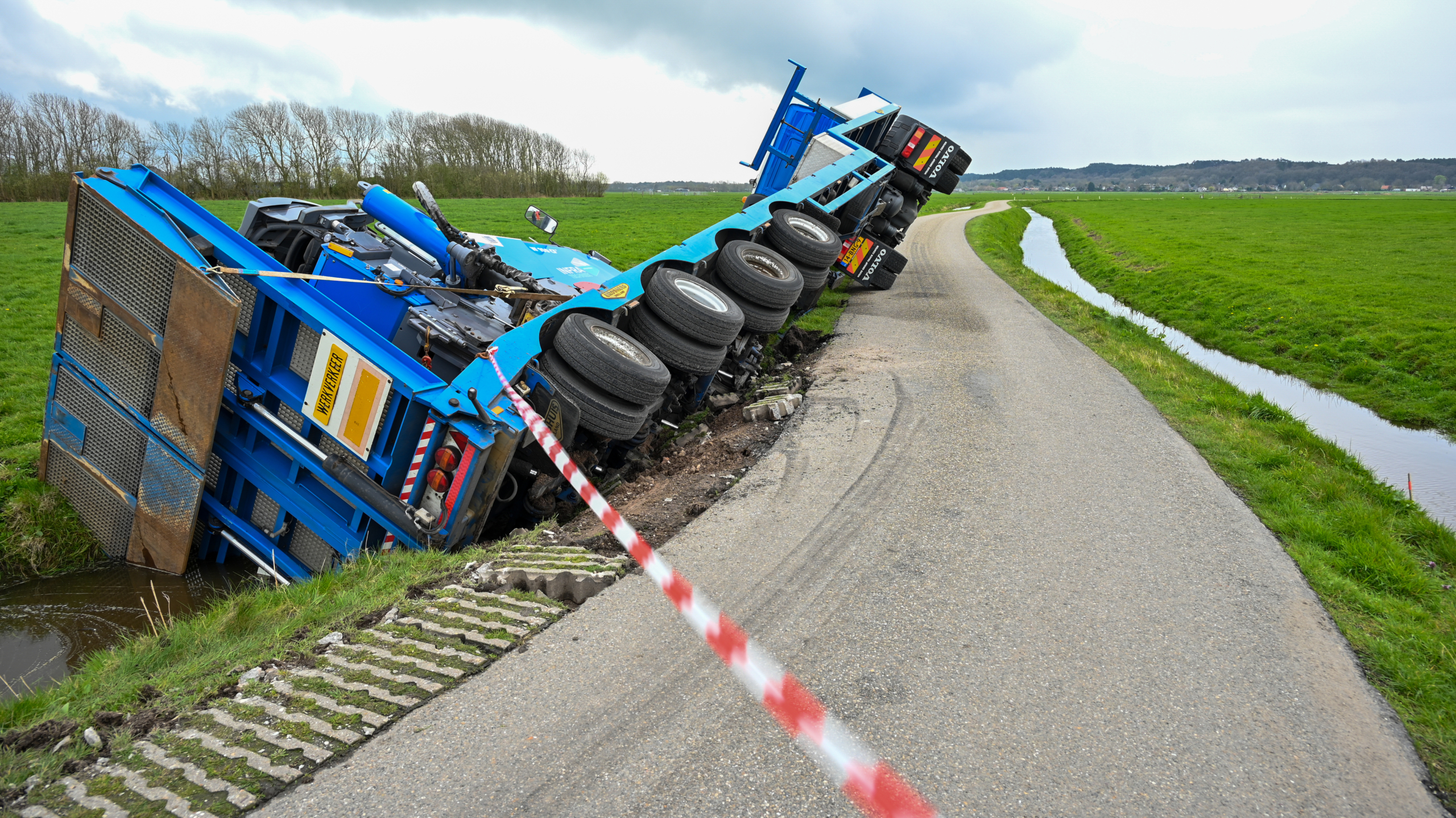 Een vrachtwagen met dieplader is in het water belandt langs de Hogenweg in Schoorl. Dat gebeurde woensdagochtend. De chauffeur raakte niet gewond.