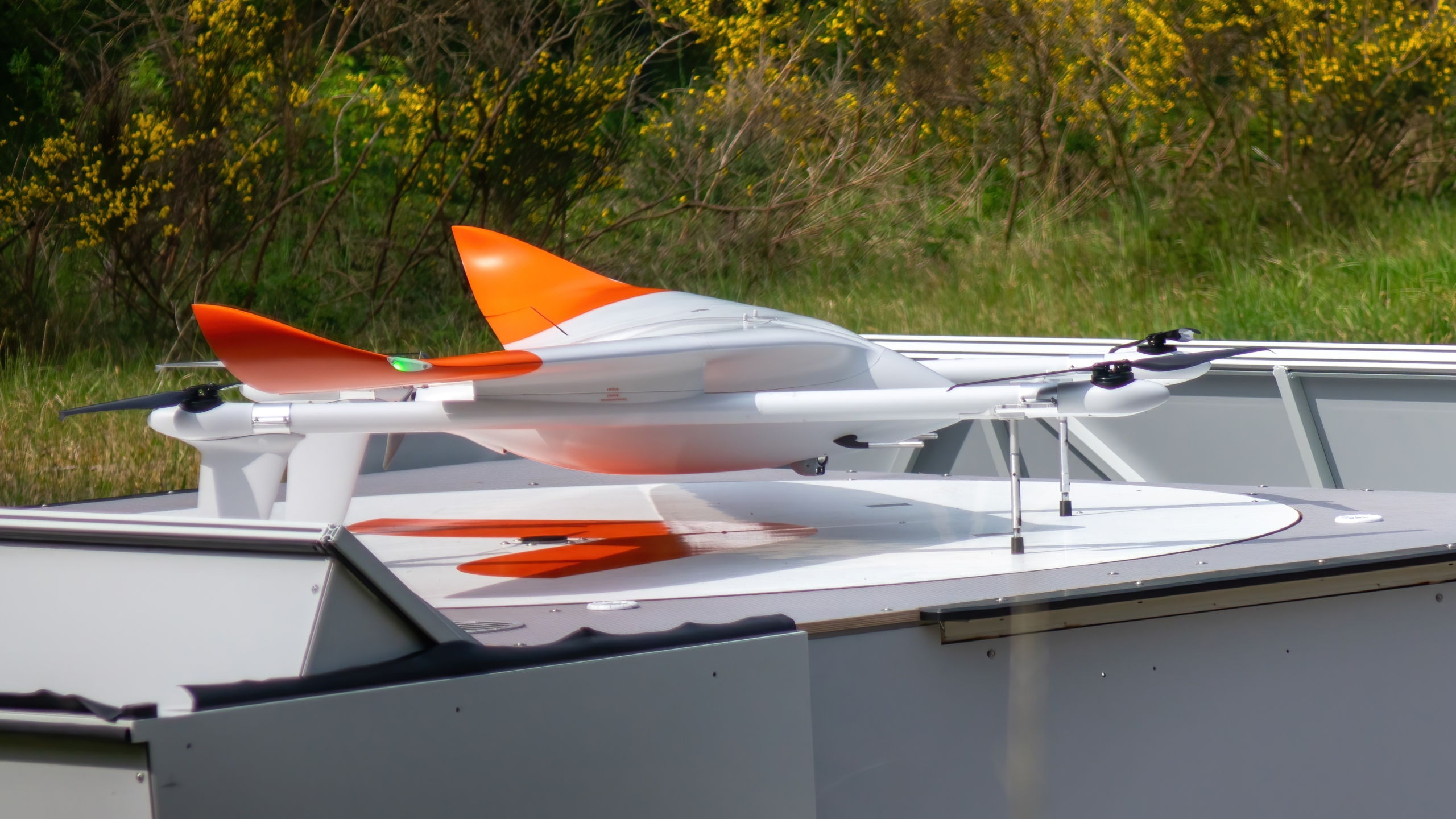 Het gaat om een zogenaamde 'hybride drone'. Dat is dus niet het bekende model met alleen meerdere propellers dat als een helikopter vliegt, maar een drone met óók vaste vleugels. Door te vliegen als een vliegtuig wordt de vliegduur en daarmee het bereik vergroot. Maar de voordelen van de helikopter - zoals stilhangen en verticaal opstijgen en landen - blijven toch behouden. (Tekst gaat verder onder de foto)