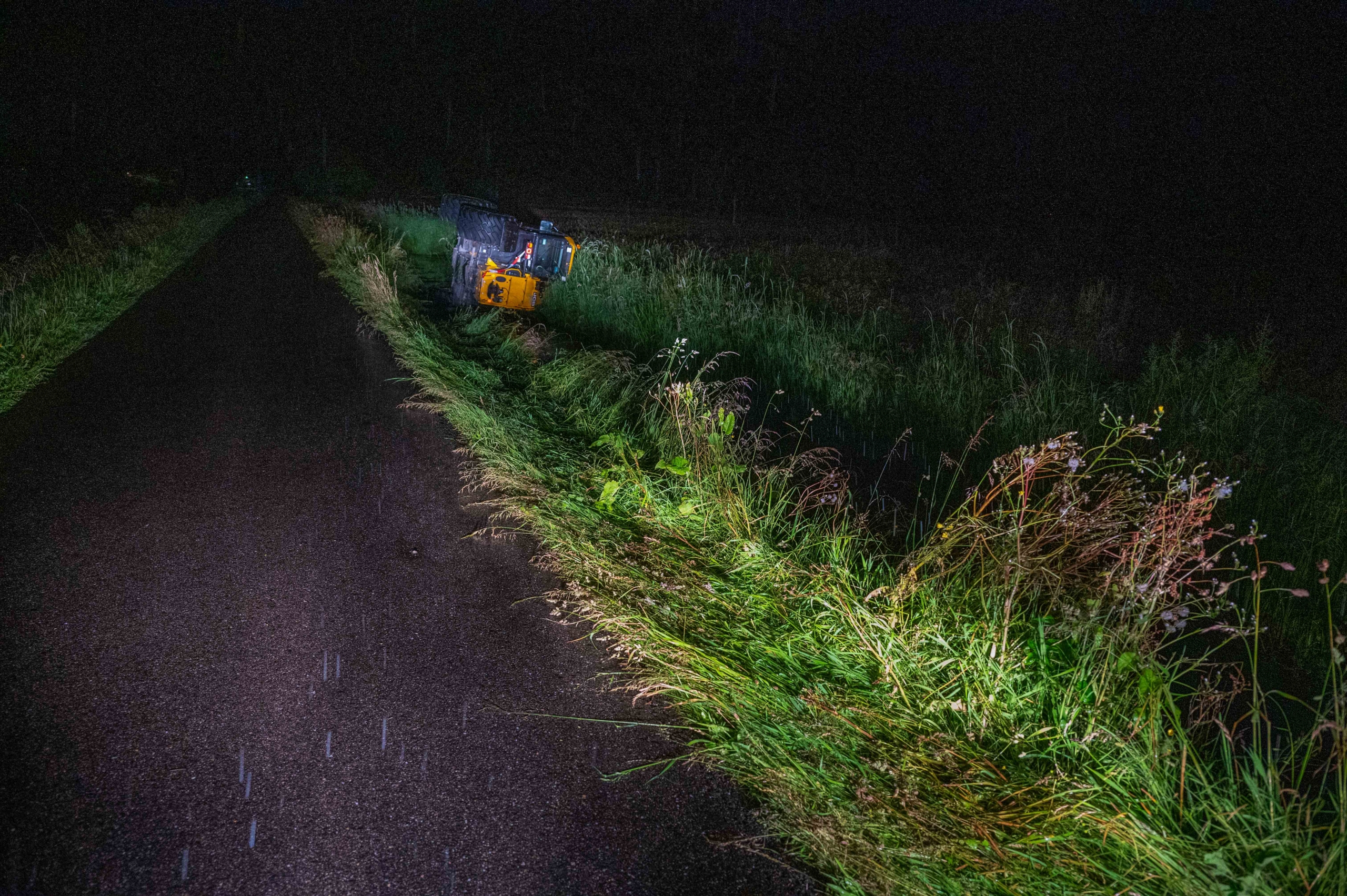 De Shovel was in de smalle en natte berm terechtgekomen en gekanteld, en lag nu op zijn kant in de sloot. Hij kon zelf uit de machine klimmen en was niet gewond geraakt.